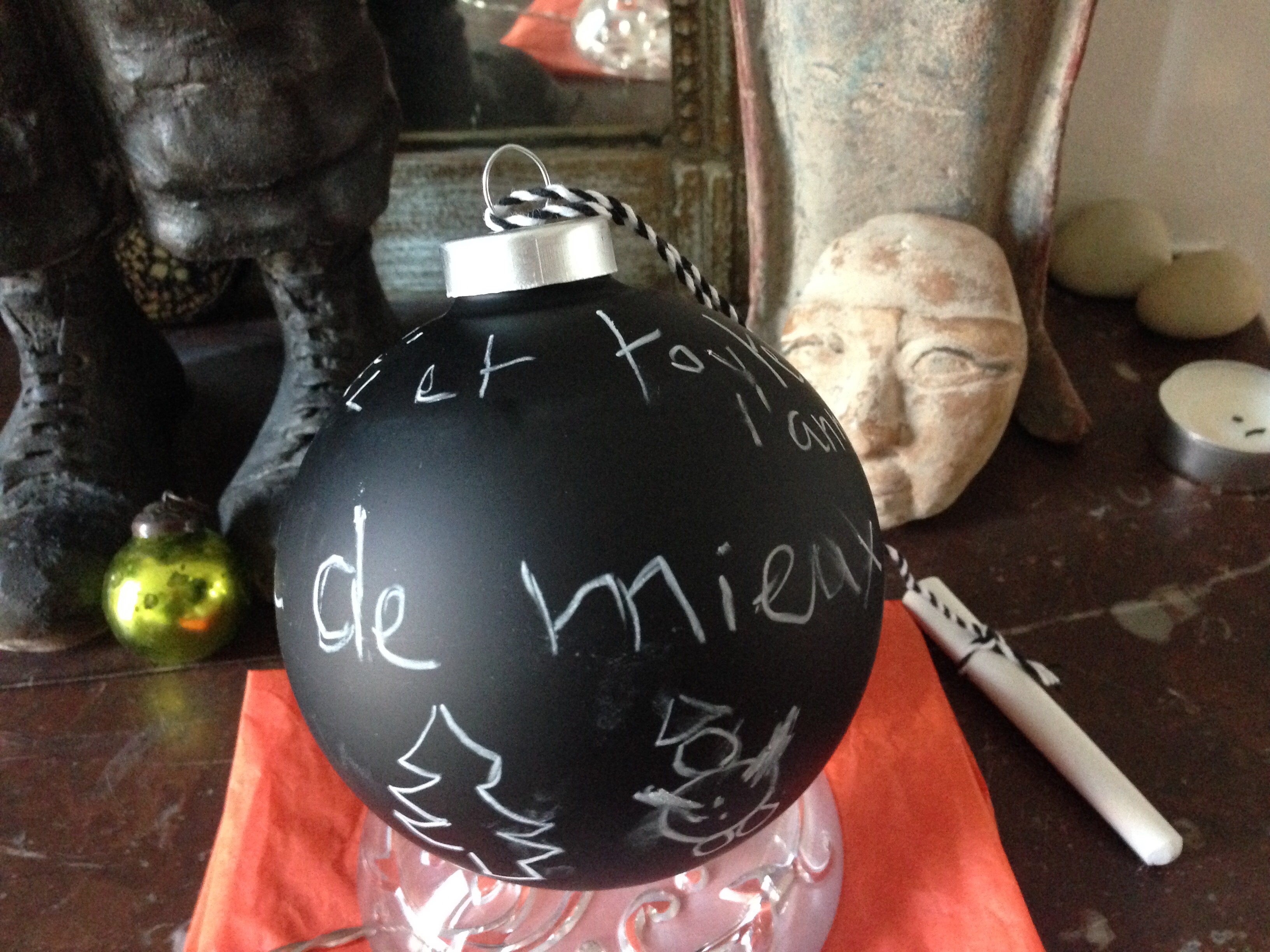 Chez « Merci », les étales proposent des jolies boules de neige, des petites et des grandes, habitées par des sapins, un Père Noël ou deux enfants comme ici, qui s’apprêtent à s’embrasser. Et autre découverte, une boule avec un revêtement de type ardoise qui permet d’écrire des pensées, des vœux ! Enfin, des petits ornements pour le sapin, fragiles, mais très beaux, on croirait qu’ils proviennent du grenier de nos ancêtres.