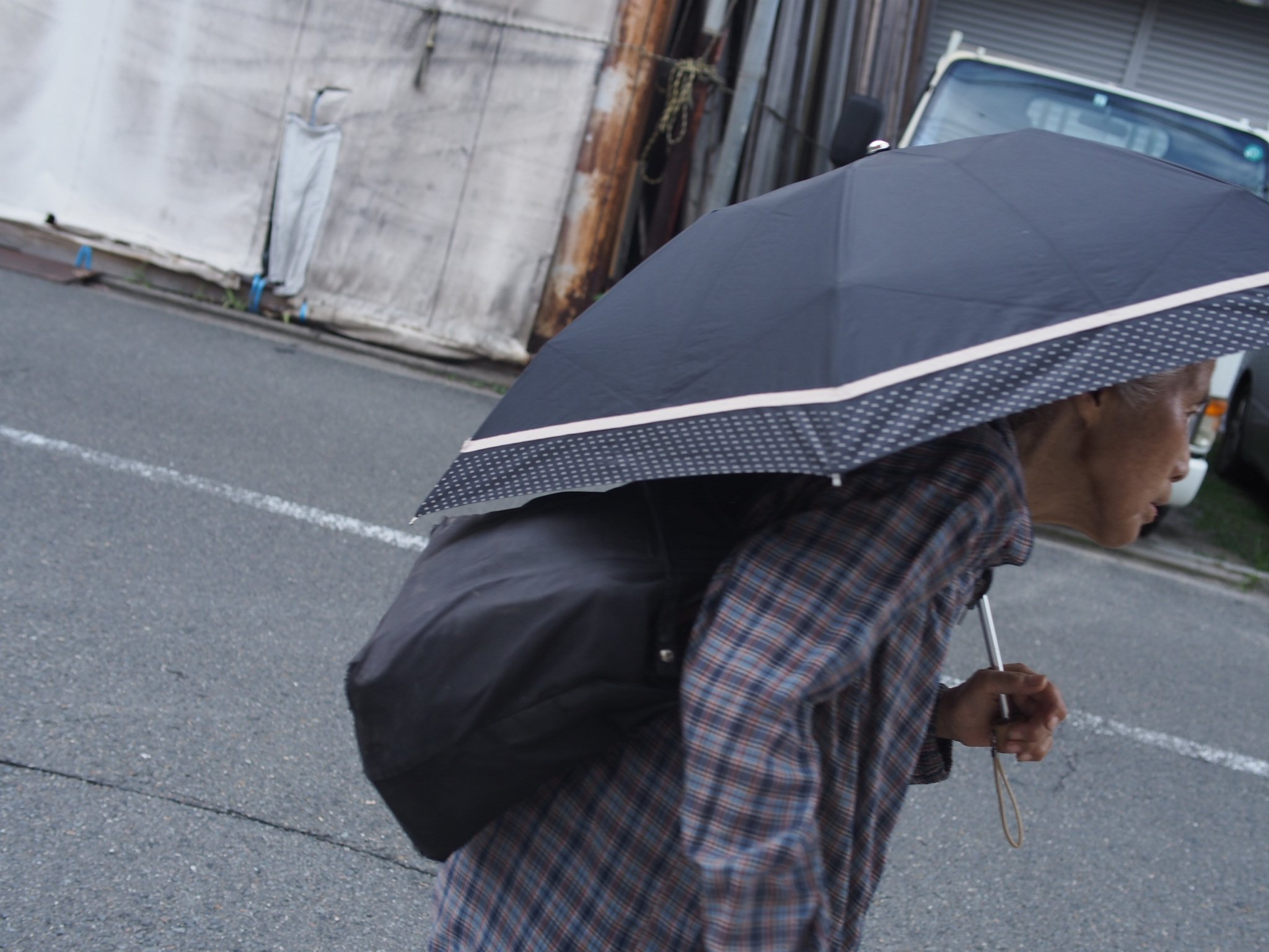 Décidément, je ne trouve pas le sommeil. Je regarde mes photos et me vient l’idée de réunir des portraits pris, ici ou là, à Kyoto, d’inconnus penchés (sauf qu’en vérité ils sont peut-être droits et verticaux et c’est mon regard qui serait bancal…) : soit par trop de vivacité, la jeunesse étant le 1er mobile, soit par des lumbagos plus ou moins temporels, la vieillesse étant coupable, et pourtant ici on vit longtemps (record mondial sur l’île de KYUSHU, plus au sud) malgré la distance au tatamis au lever comme au coucher ! C’est une piste à creuser, dormir plus près du sol, doit aider à conserver sa carcasse en place, avec le riz bien sûr !