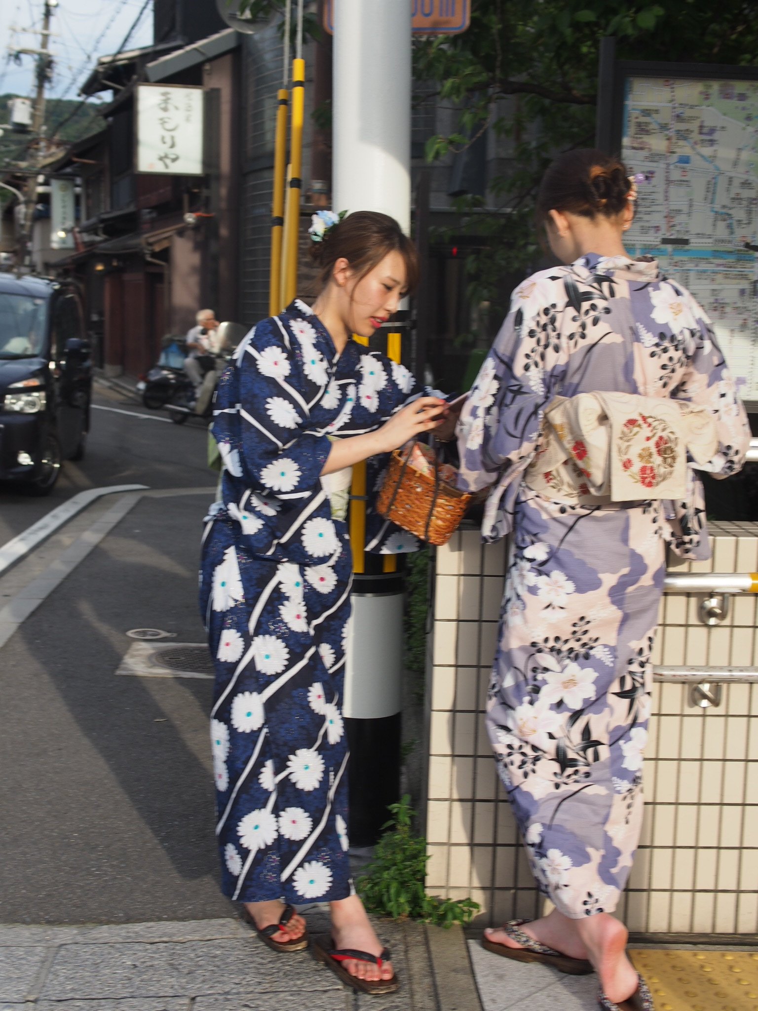 Deux jeunes filles en kimono avec leur petit sac en osier tressé attendent, légèrement, penchées vers leur portable l’appel du prince charmant. Telles des Cendrillon modernes, ils se retrouveront au pied du métro, tout près de la Kawa.