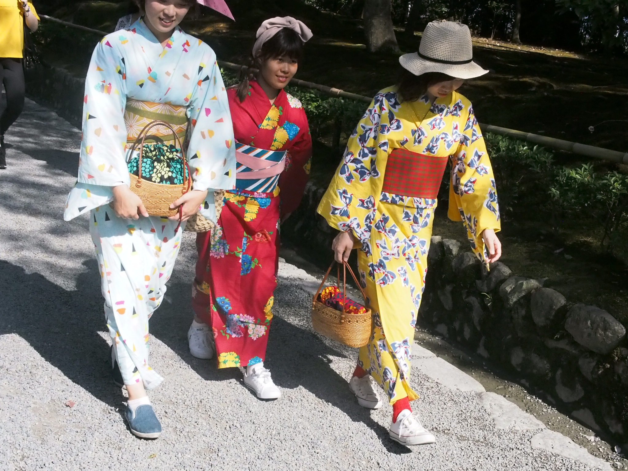Ces 3 jeunes filles en kimono m’ont fait marrer, chaussées de leurs baskets. Par tradition, elles sont censées revêtir des getas, des tongues en semelles de bois. Ça fait un bruit de dingue et la démarche des japonais(es), en getas, c’est un peu empêtré, aussi laid que les mannequins sur un podium…
