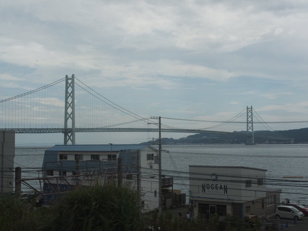 « Ceux qui m’aiment prendront le train », d’ailleurs les petites villes japonaises, les amis ou les familles éloignées des mégapoles doivent l’être « aimables » car les Japonais se concentrent dans les gares, de façon impressionnante, le samedi matin. C’est chouette de se retrouver dans un train de banlieue comme si j’étais d’ici. Je reste debout puis une place se libère. Nous empruntons la ligne de Sanyo et pendant un moment, nous longeons la mer de Seto appelée mer intérieure aussi. Quelle joie, je pense à Ozu, ses films et je trimballe mon sac comme si je rentrais chez moi, à la campagne. Je regarde par la fenêtre mais je suis du mauvais côté, alors je me lève pour prendre deux photos car j’aperçois le pont du détroit d’Akashi de Kobé. Mon voisin me demande si j’ai réussi mon cliché, et je lui souris en lui disant « oui et merci. »
