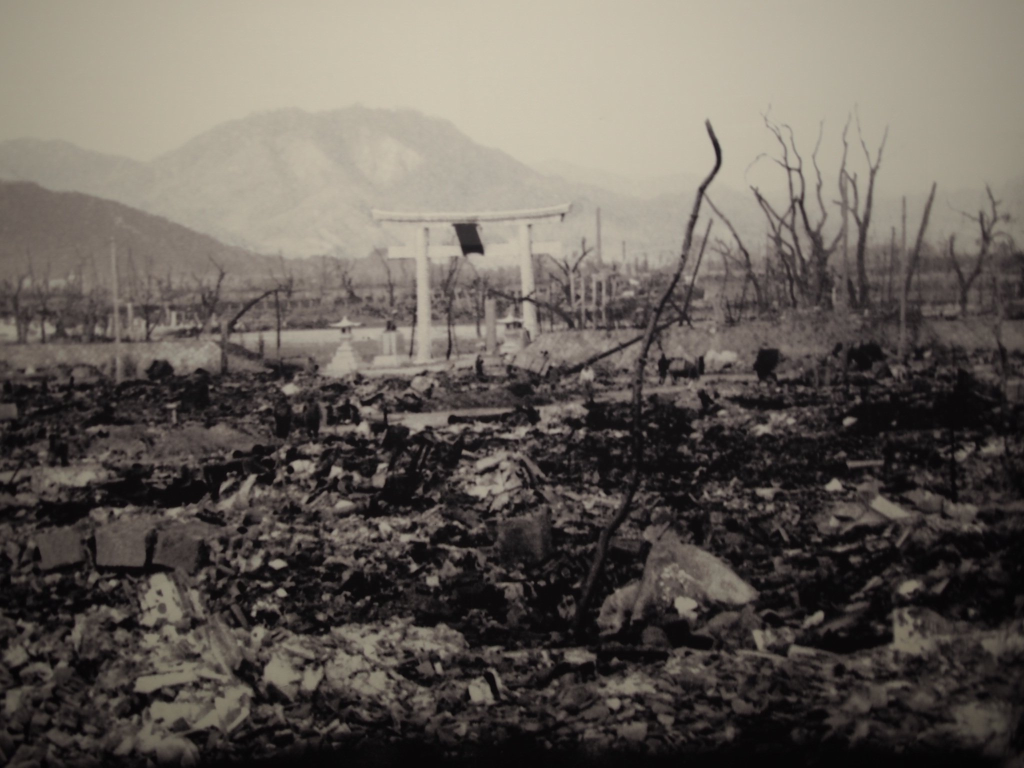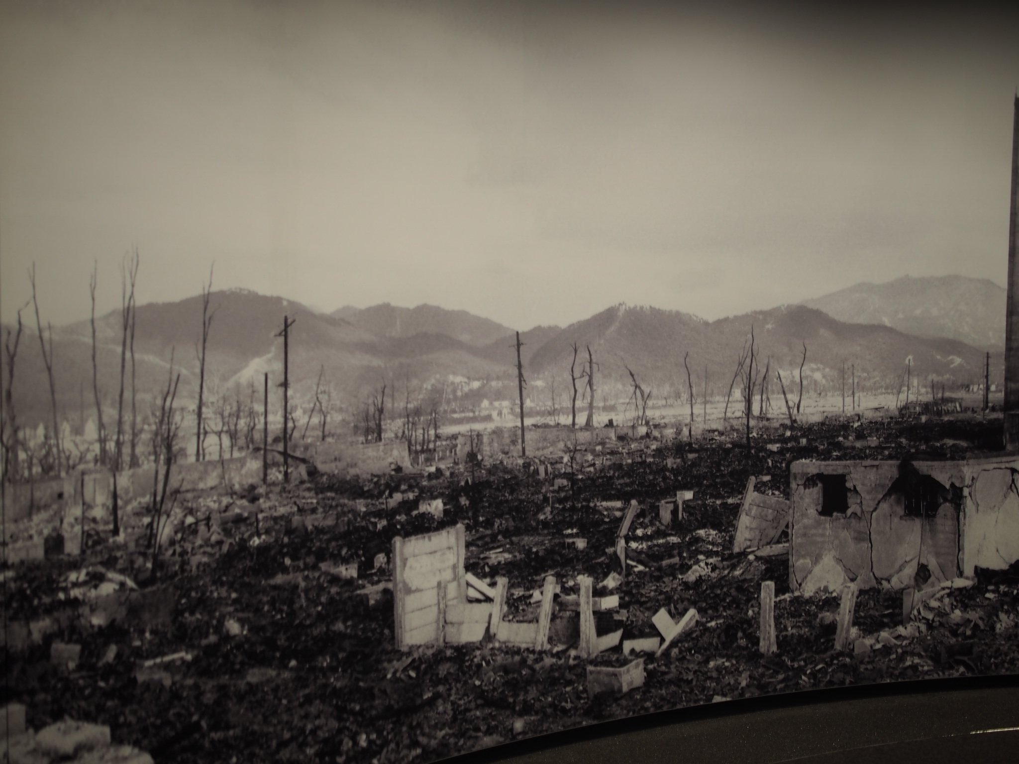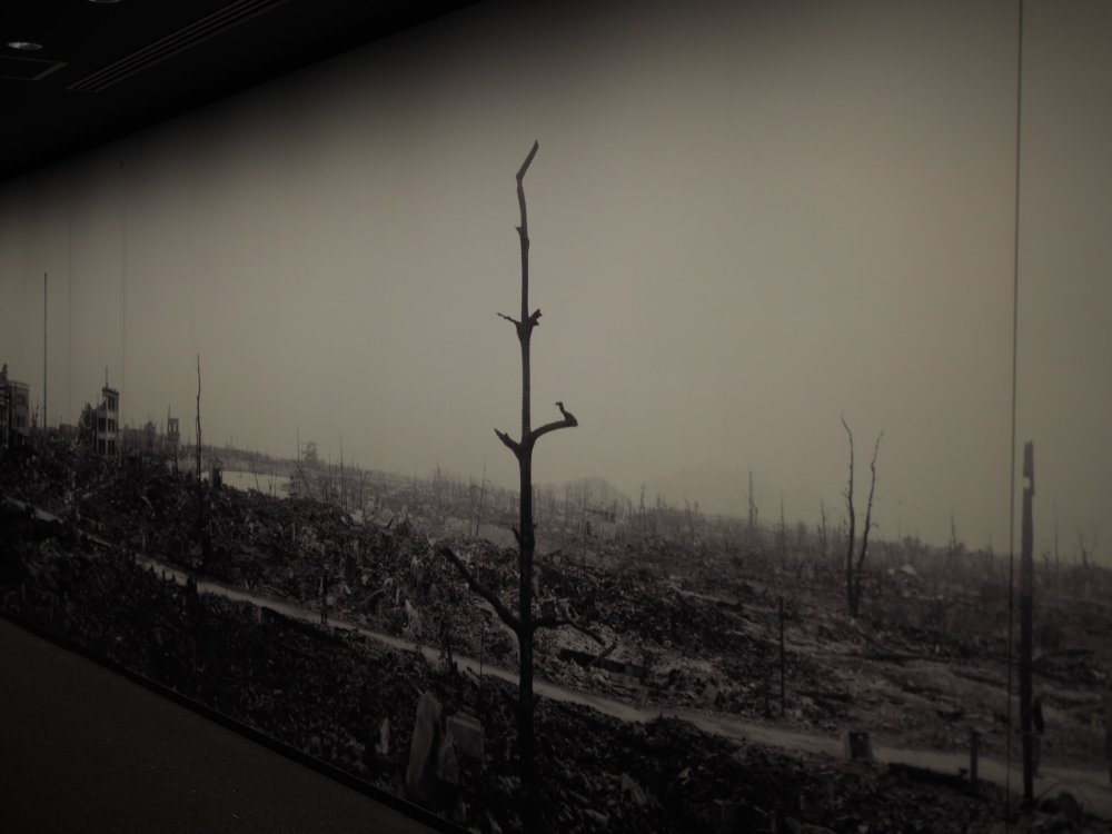 Témoignages, photos, textes et film pédagogique reconstituent la vie, avant et après, l’explosion de la bombe A, dite « little boy », à 600 km au-dessus de Hiroshima. Le dôme de Genbaku se situait à quelques centaines de mètres de l’épicentre. La bombe d’un diamètre inférieur à un mètre contenait l’équivalent d’un petit cube d’uranium 235 pour permettre la fission. Outre l’explosion qui a frappé la ville, une forte chaleur provoquée par la radiation, suivie d’une pluie noire se sont succédé et l’ont anéanti ainsi que ses habitants. Plus de 100.000 morts en quelques minutes, des maladies foudroyantes dans les jours qui ont suivi et des blessures à vie.