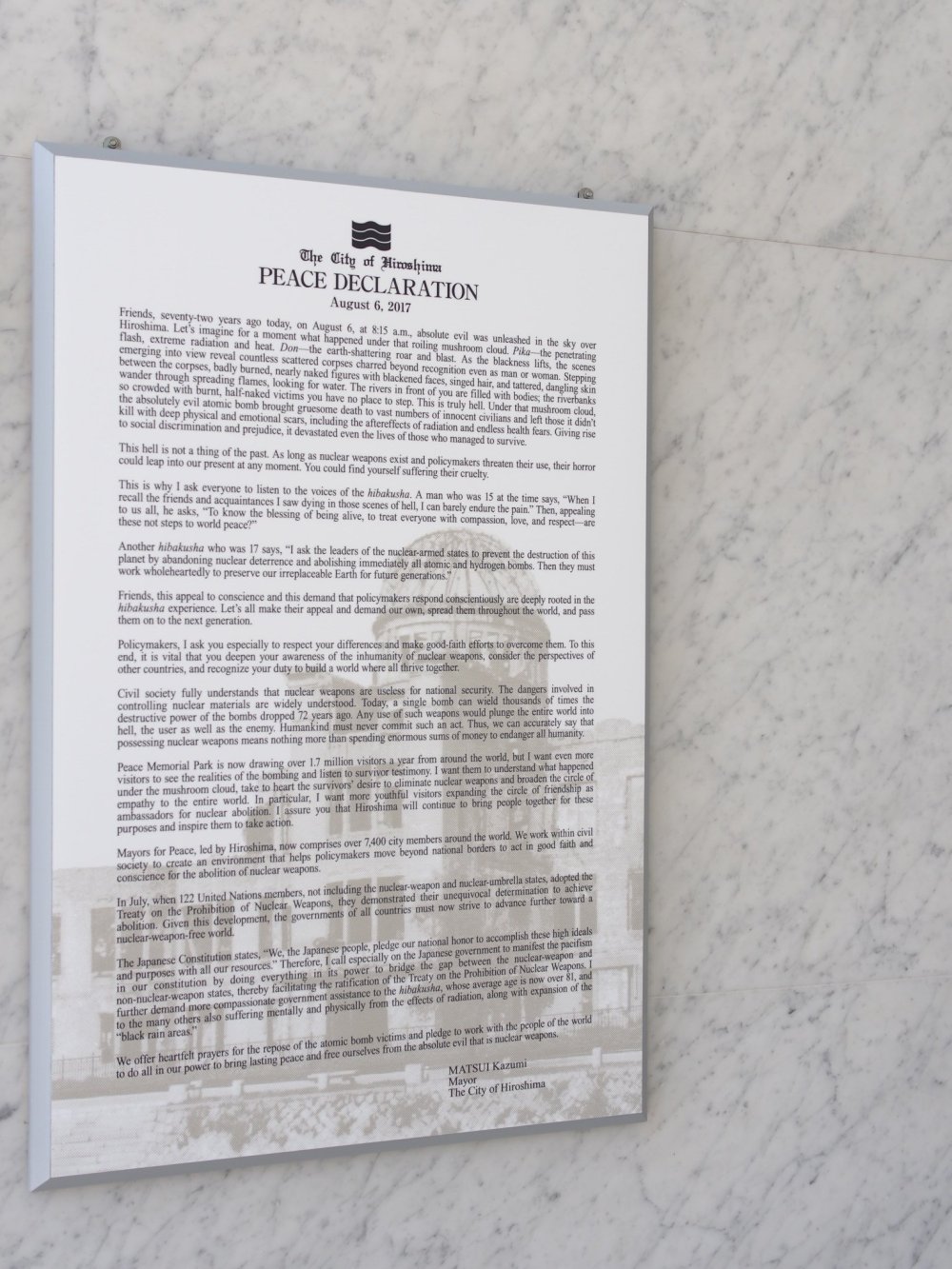 Le mémorial de la paix c’est près de 2 millions de visiteurs par an. Et puis, il y a la déclaration de paix signée, cette année, par le maire d’Hiroshima et la venue d’Obahama.