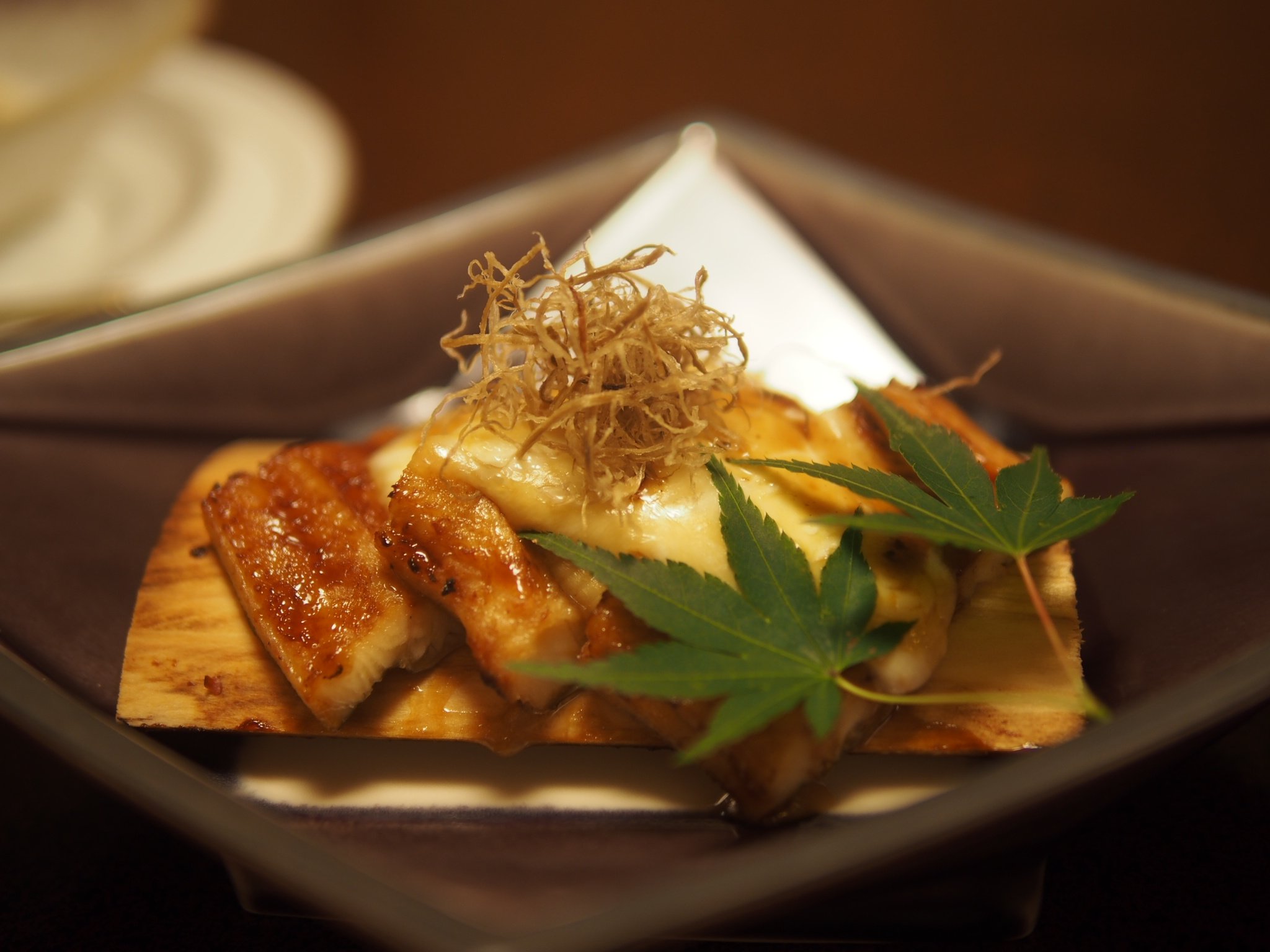 Après cet intermède, elle m’a servi une anguille séchée recouverte d’un duvet de mozarella, passée au four,  subtilement poivrée, et imprégnée de sauce soja, c’était grand en finesse et en légèreté. Cette anguille là, je ne saurais vous la décrire mais elle n’a rien à voir avec ce que j’ai déjà goûté.