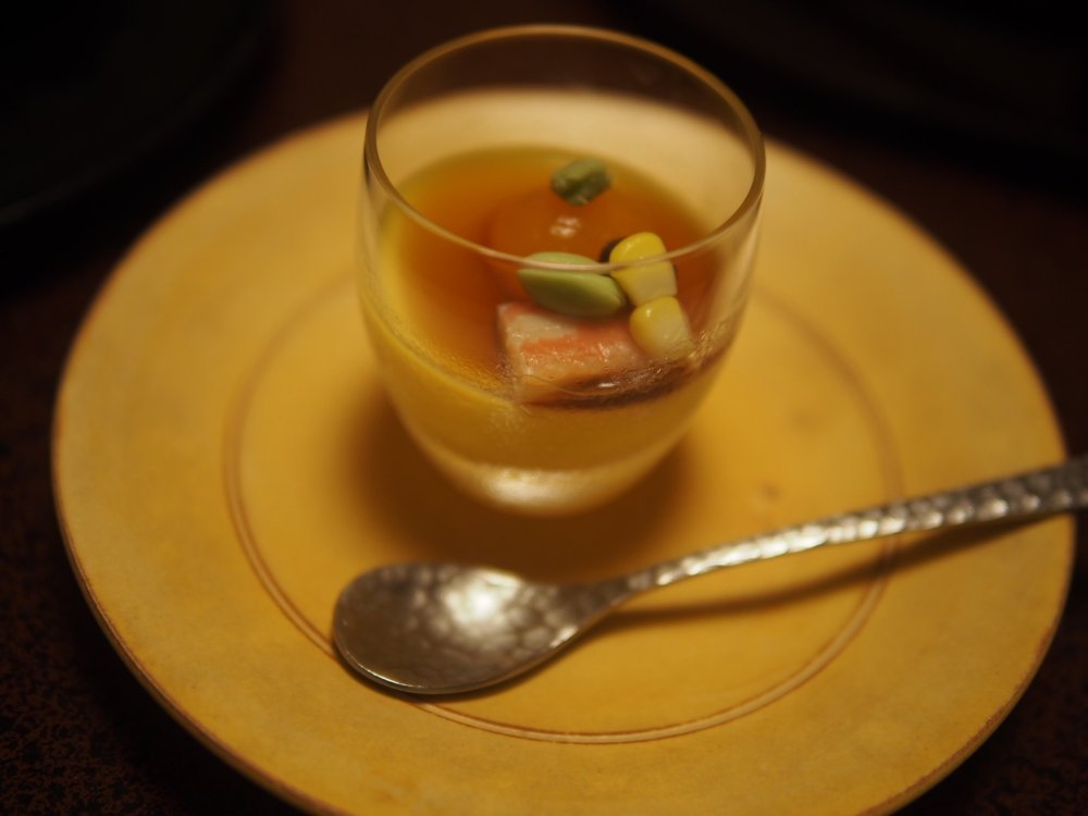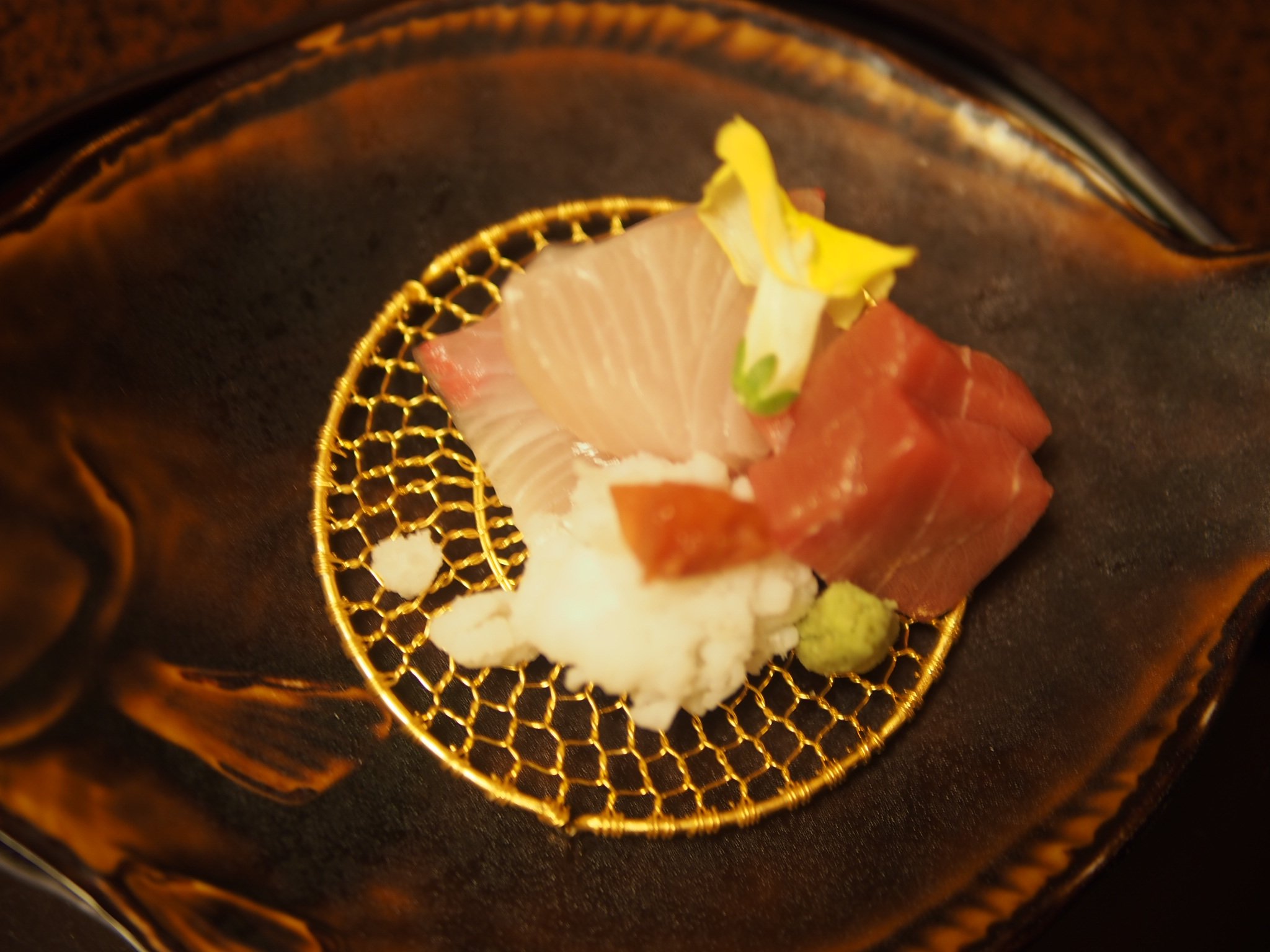 La première mise en bouche ressemble à un œuf mollet sublimé, puis je goûte l’assortiment de légumes de saison et le poisson fumé de type maquereau. C’est très subtile, fondant en bouche, croquant, présent, mais pas tappe à l’œil. Et pour autant, je ne reste pas la tête dans le vague et les baguettes à la renverse, j’avance, je poursuis avec les trois poissons crus, à savoir du thon, du yellow fish et du ? avec de la sauce soja et une pointe de raifort. Waouh ça part fort. Je ne sais plus qui je suis ni où j’habite !