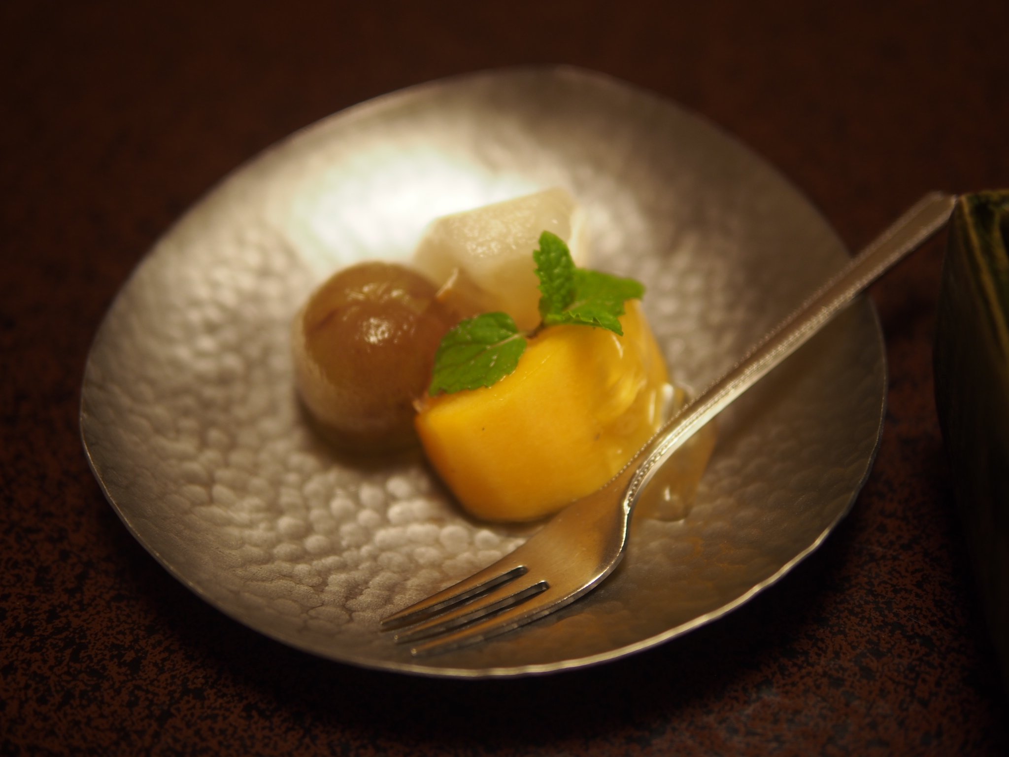 Enfin, trois quartiers de fruits frais : un litchi comme jamais je n’ en ai vu ni mangé une mangue croquante pas exubérante en nectar et une poire de Kosui, qui vaut la William. Aie aie aie !
