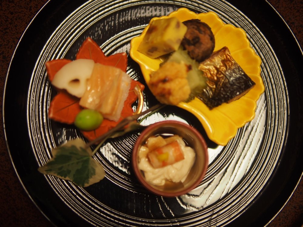 Tout d’abord, une hôtesse, entre avec son plateau, après avoir fait « knock knock » à ma porte, pile à l’heure du dîner planifié à 19h, ça ne rigole pas, l’heure c’est l’heure, surtout lorsqu’il est question de gastronomie. Elle nettoie la table, pose le menu plié sur celle-ci, installe les baguettes sur un présentoir en verre et me dit à tout de suite. Elle revient avec les trois premiers plats dont deux mises en bouche et un petit verre. Elle apporte aussi la petite bouteille de saké que j’ai commandée à part pour accompagner le repas. La bouteille est présentée inclinée dans une boîte remplie de glace pilée.