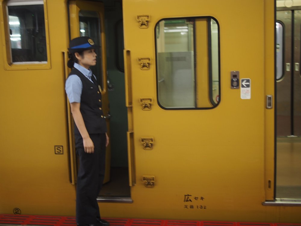 De là, j’ai retrouvé la gare à 5 min et j’ai pris un train de banlieue bondé jusqu’à Hiroshima station. Le trajet a bien duré une demi-heure. Les jeunes sont tous concentrés sur leur iPhone, ils jouent ou envoient des messages et consultent le Web. La mondialisation est une réalité. Étonnamment, ils ne cèdent pas leurs places assises aux plus et mêmes très âgés co-voyageurs. Des femmes conduisent ces trains, j’en ai croisé une, on aurait dit un playmobil en tenue orange avec un casque jaune. La mienne était habillée comme une contrôleur de train français.