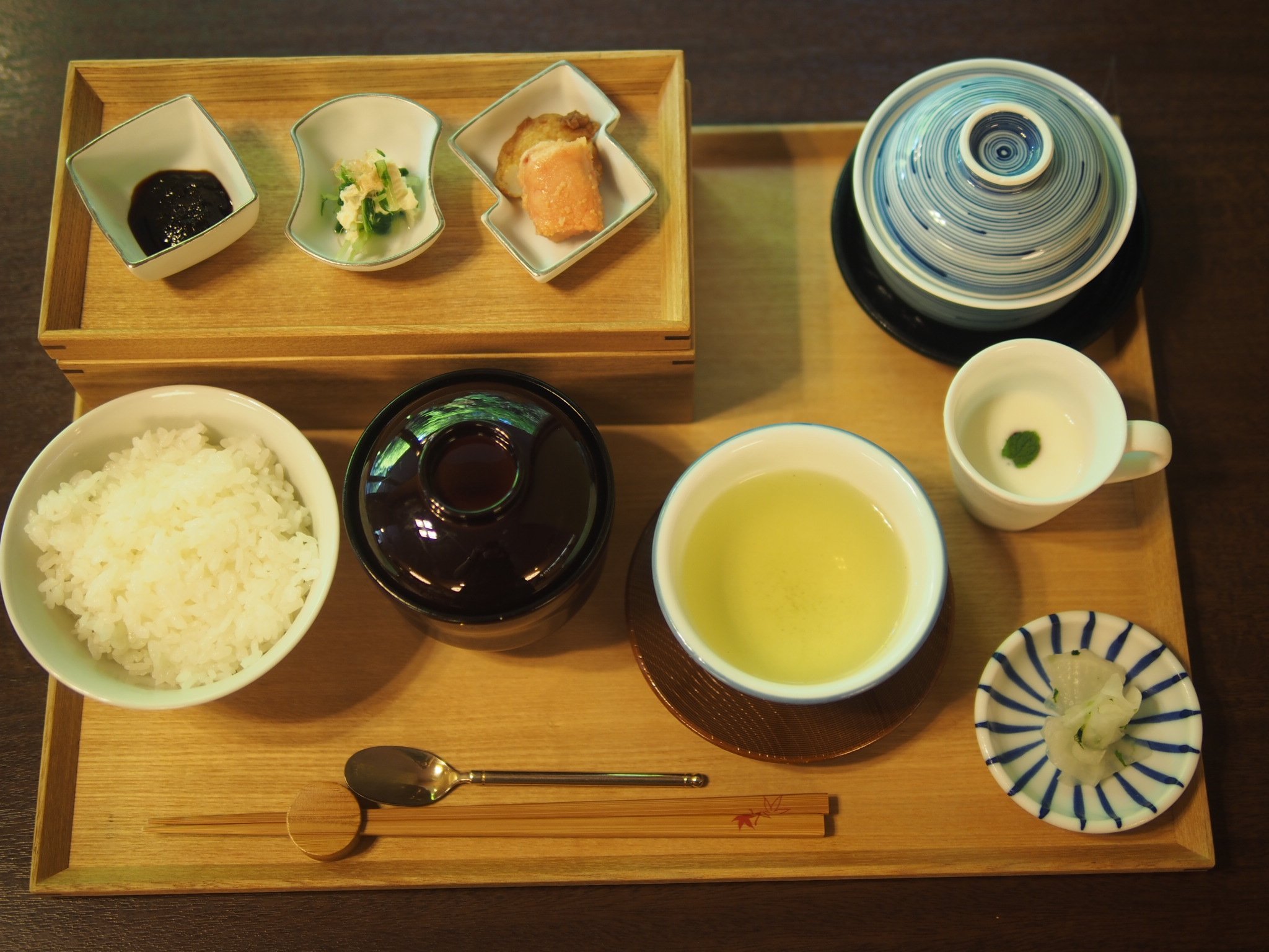 Ce matin, donc, un creux à l’estomac m’a réveillée vers 6h, j’ai poursuivi la dégustation de la veille car un petit panier avait été prévu à cet effet. C’était léger et très fin, une tempura de riz me suis-je murmurée, et la bouchée me remettrait sur pieds. Ablutions, habillage, paquetage, check-out avant de rejoindre la salle à manger pour le petit déjeuner à la Japonaise, un délice, sans jardin. Une soupe miso, un bol de riz, du hareng fumé, du saumon frais grillé, une part d’omelette, et un bol de thé vert sans oublier un petit pot d’une forme de fromage blanc, sans acidité, accompagné d’un coulis de fruits rouges.