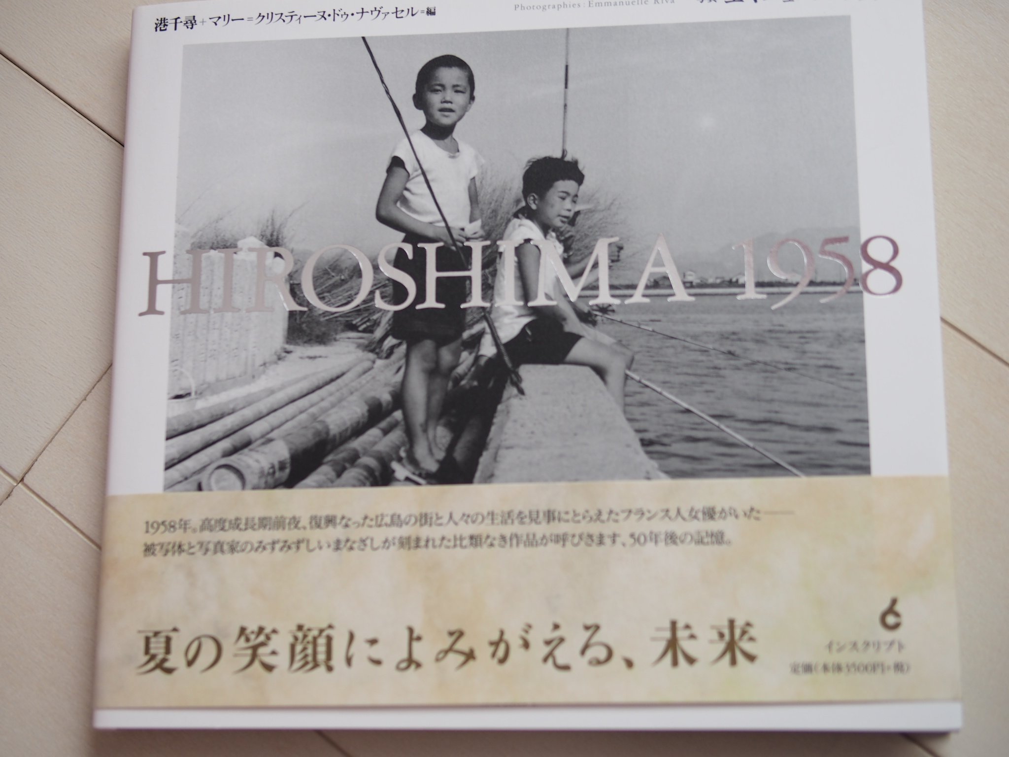 Après le déjeuner, j’arrive deux heures trop tôt à la Guest House pour le check-in donc je me balade. Ça dure deux secondes car dans la même rue, je tombe, par pur hasard, pas si sûr, sur une librairie café salle de cinéma. Je leur explique ce besoin d’attente prolongée, je commande un café et ils m’offrent un gâteau. Ils ont une machine à café Chemex comme moi et une bouilloire, la même qu’à la maison ! Elle me dit, qu’avec son mari, ils ont ouvert cette librairie, il y a 6 mois, et qu’ils vivaient précédemment à Nagoya. Elle était prof d’anglais, lui a en a eu marre de son boulot en entreprise et il voulait revenir sur la terre de son enfance… Elle me montre des livres sur l’alphabet japonais (hiragana, le plus simple et le takakana plus complexe) et sur les kanji (ils en utilisent 2.000 dans la langue courante, ce sont leurs idéogrammes hérités du chinois). Ces livres pour enfants, qu’elle a sélectionnés, sont graphiques et ludiques, je les regarde et les mets de côté. Puis, je sors mon museau pour aller fureter dans les rayons et je tombe sur un livre de photos appelé « Hiroshima 1958. »