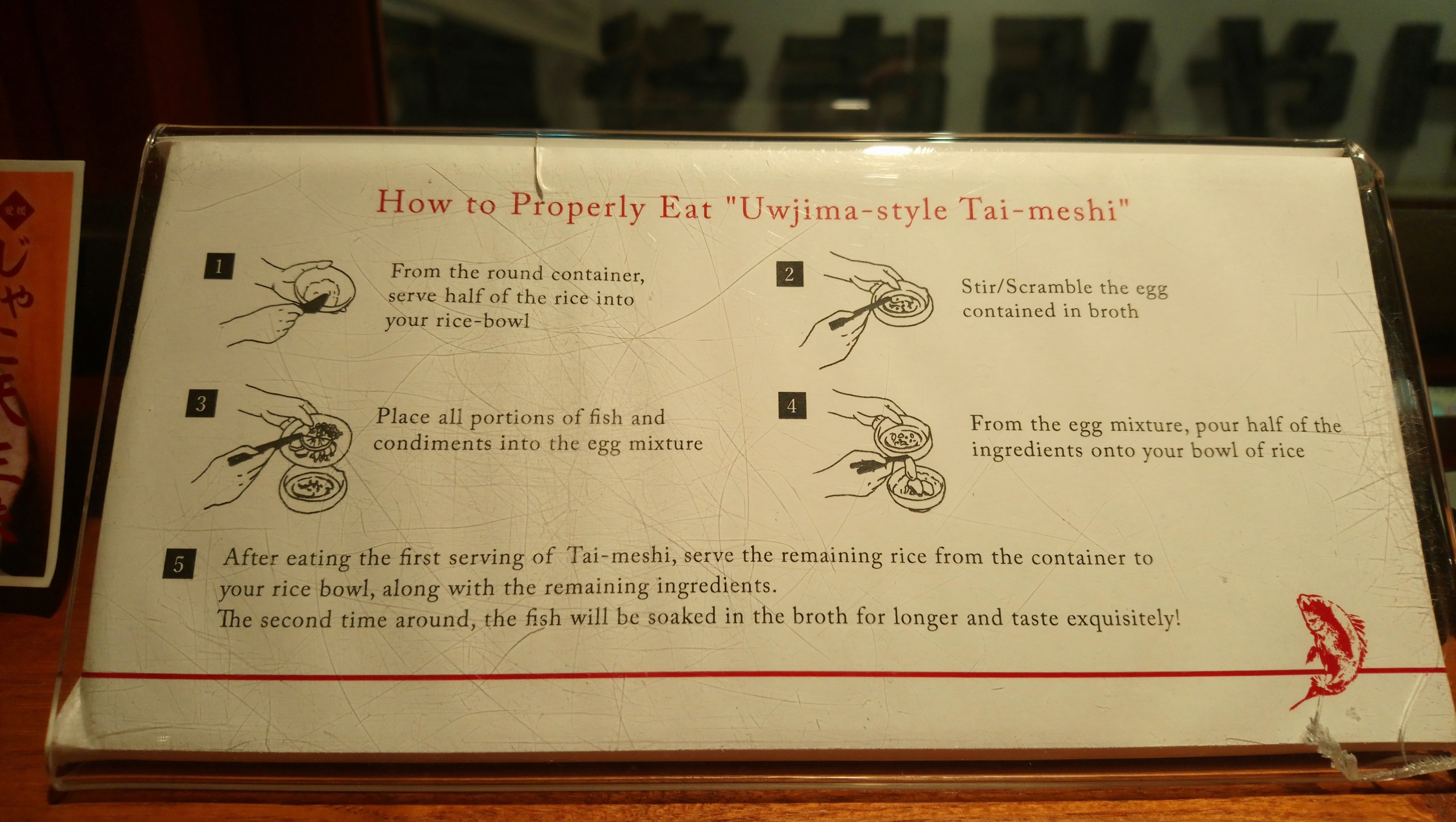 J’ai passé aussi un long moment au onsen en fin d’après midi, hier, et ce matin, et entre temps, je me suis promenée au dogo parc. Un bel endroit, un espace pour les vrais gens, on y vient pour lire, jouer, se reposer, courir ou faire un petit tour avec ou sans chien. Dans un passage, j’ai découvert un restaurant « Gansui » et chaque repas fut un régal. Le riz le midi était grillé en dessous car conservé sur une plaque chauffante. Les fines tranches de dorade fondaient en bouche. Et le soir, j’ai composé le plat en mélangeant un œuf frais avec de la dorade crue et des condiments sans oublier le riz. Ça s’appelle un Tai-maki, en voici l’explication :