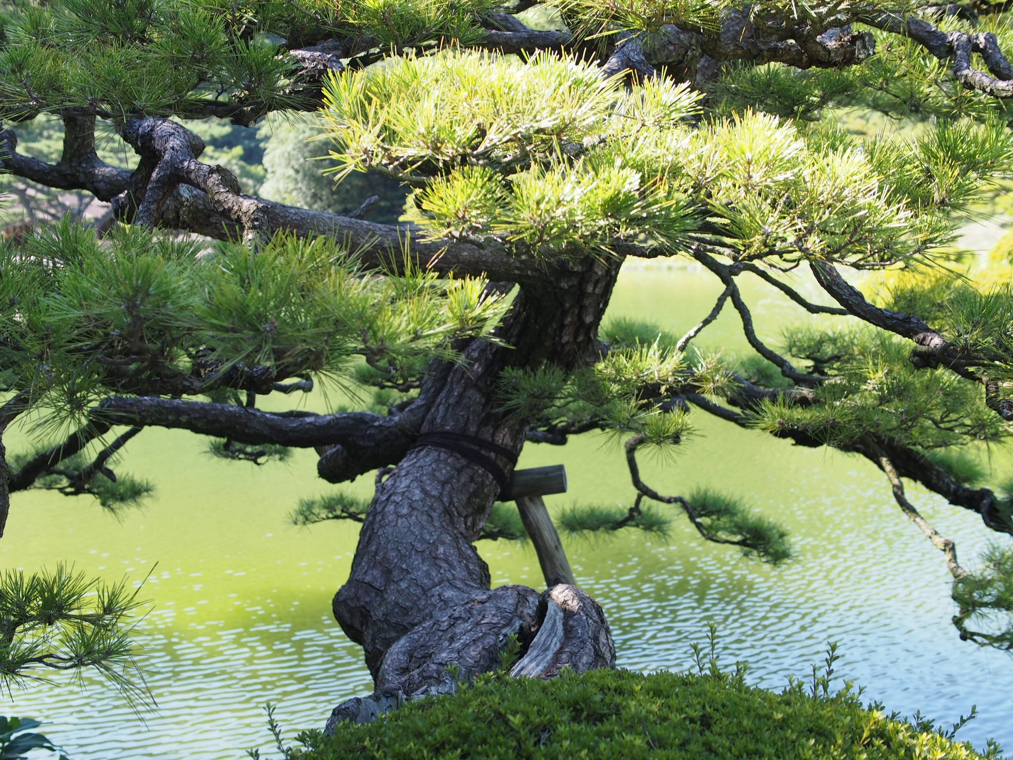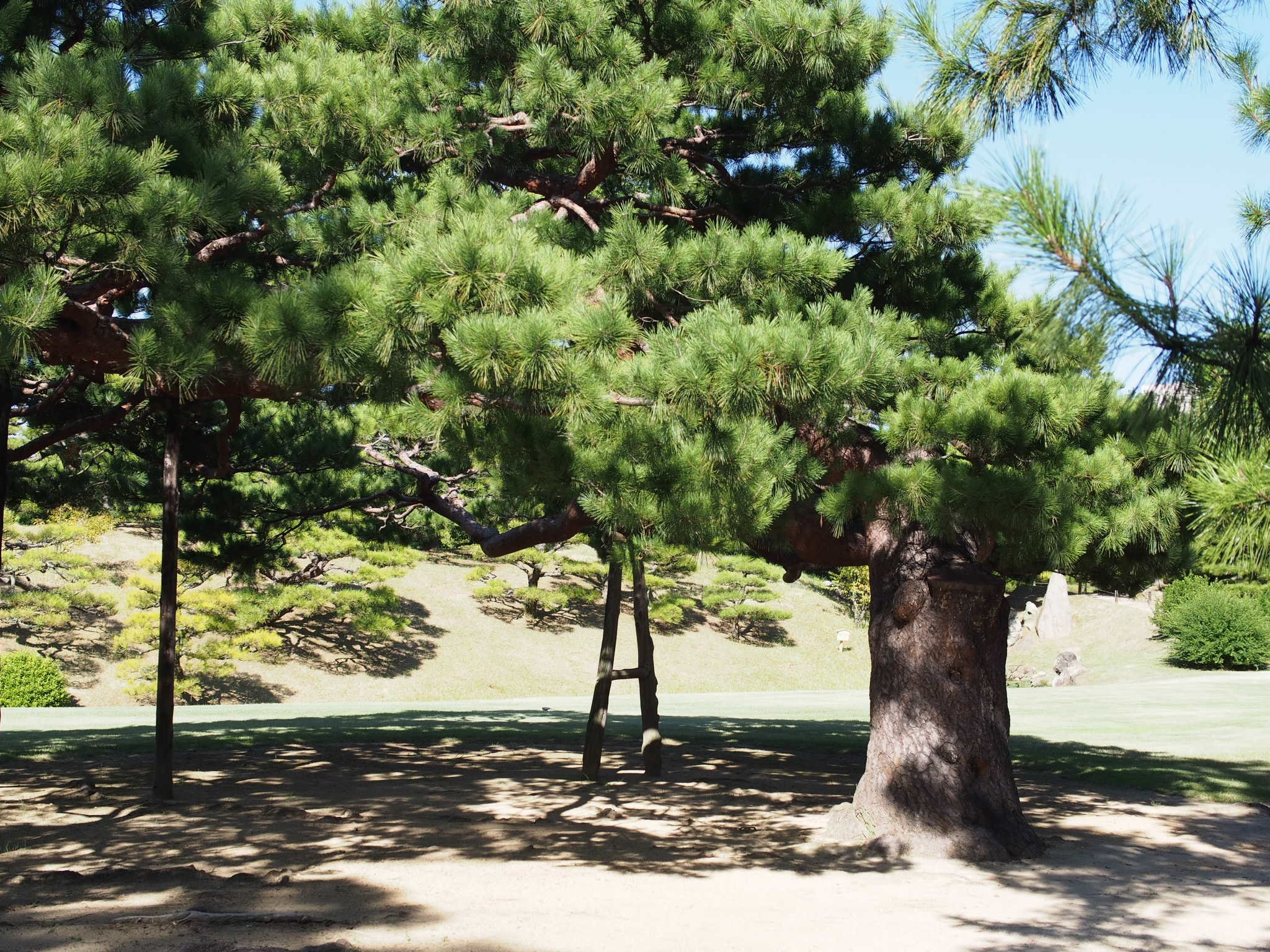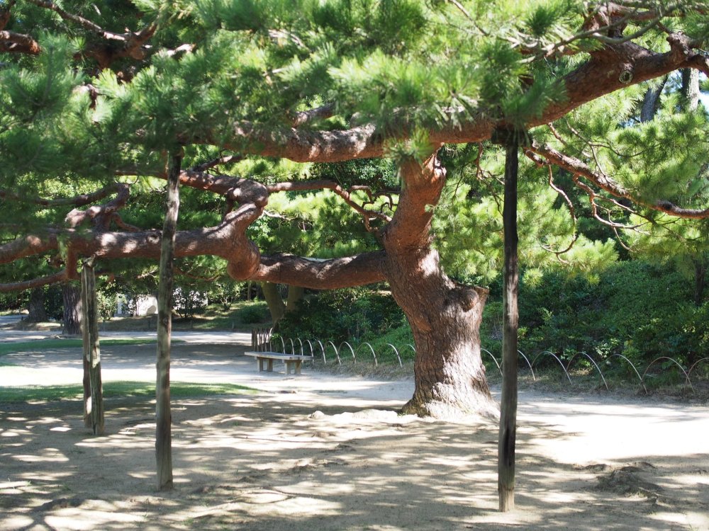 Et j’ai marché, pour savourer ces instants rares et précieux, pour digérer, dans le sens 1er et au figuré, et me voici dans un jardin extraordinaire, en plein centre ville, appelé Ritsurin. Sa création remonte au début de l’ère d’Edo, au milieu du 16ème siècle, il se compose de 6 bassins et de 13 collines artificielles. Il a été occupé comme résidence par des Seigneurs jusqu’à la restauration Meiji vers 1875. Et maintenant, c’est un parc départemental. Certains pins me laissent rêveuse, surtout celui qui me fait de l’ombre maintenant. Il est renforcé par des étais au niveau de ses trois branches. Son tronc est rouge orange comme celui des séquoias californiens sauf que celui-ci, ce n’est pas la hauteur qui l’intéresse ni le fait grimper au ciel, non, c’est l’horizontalité, et ce, sur plusieurs niveaux. Ses racines ressortent de terre et se prolongent jusqu’au bout de ses plus longues branches. Il est le pin majestueux par excellence, quelle présence le bougre ! Son tronc boursouflé supporte la charge grâce au renfort des étais, il se plaît ici, les oiseaux et moi aussi !