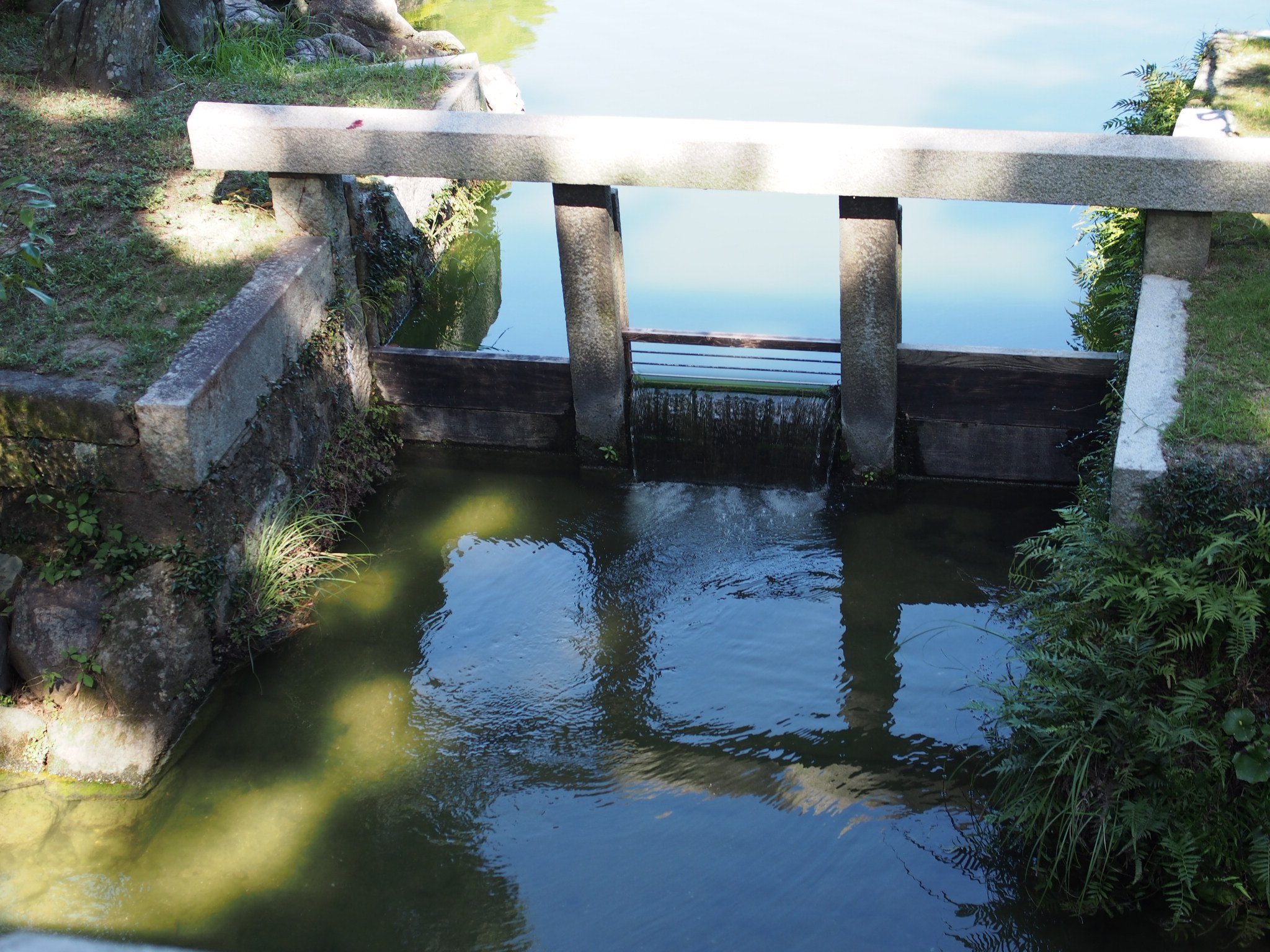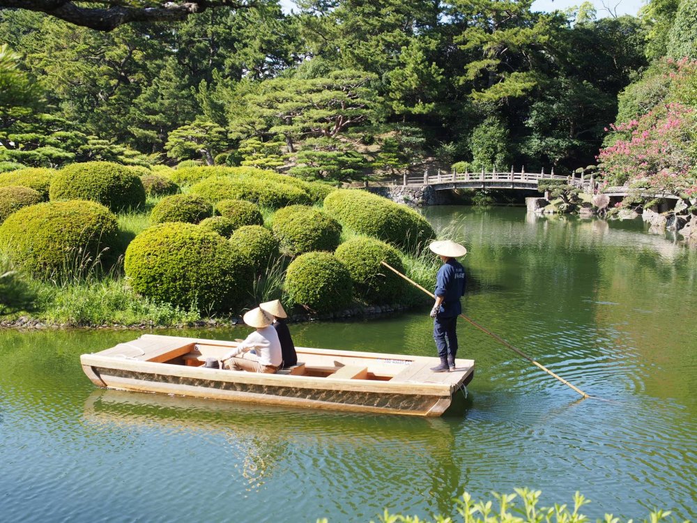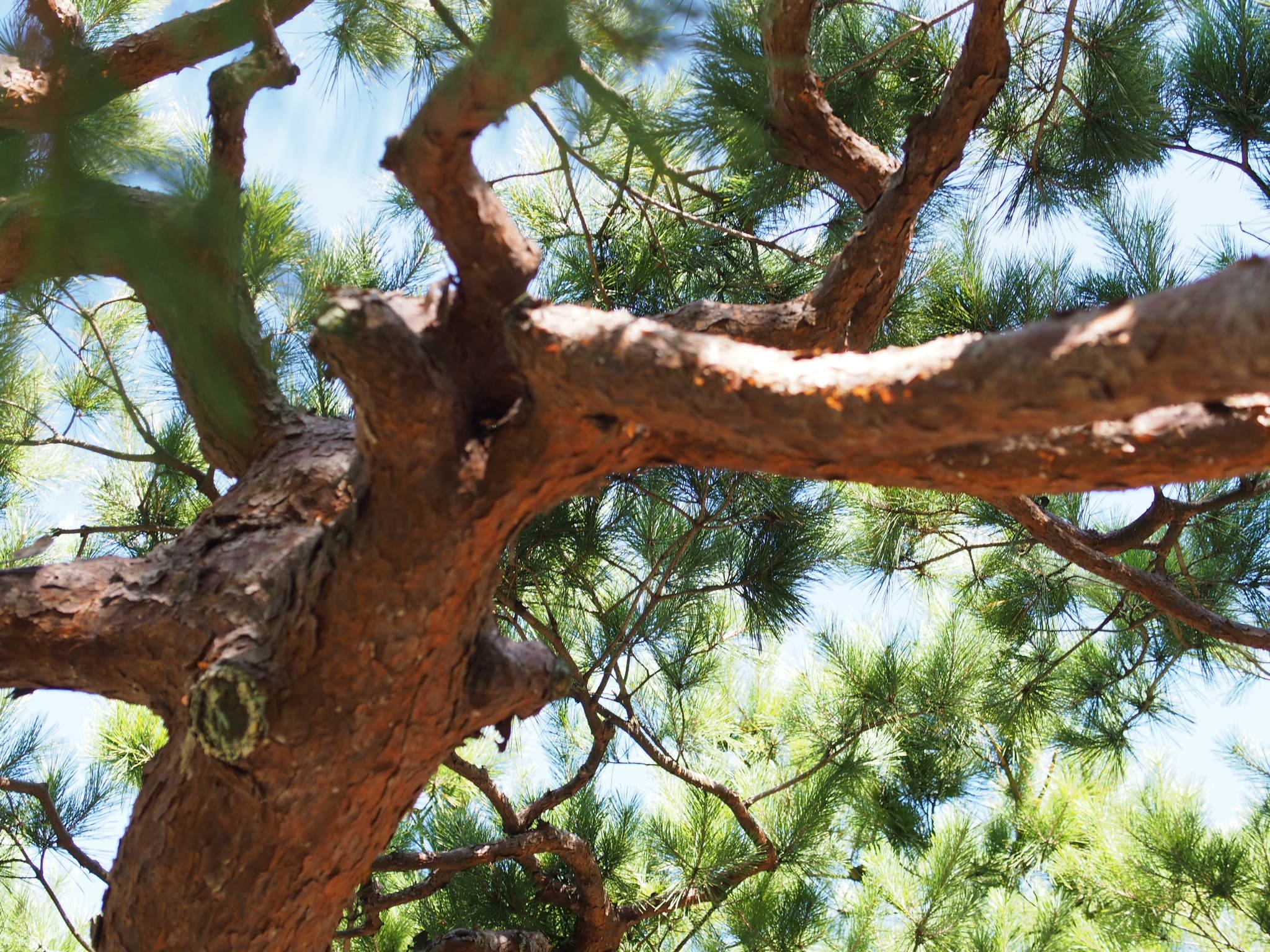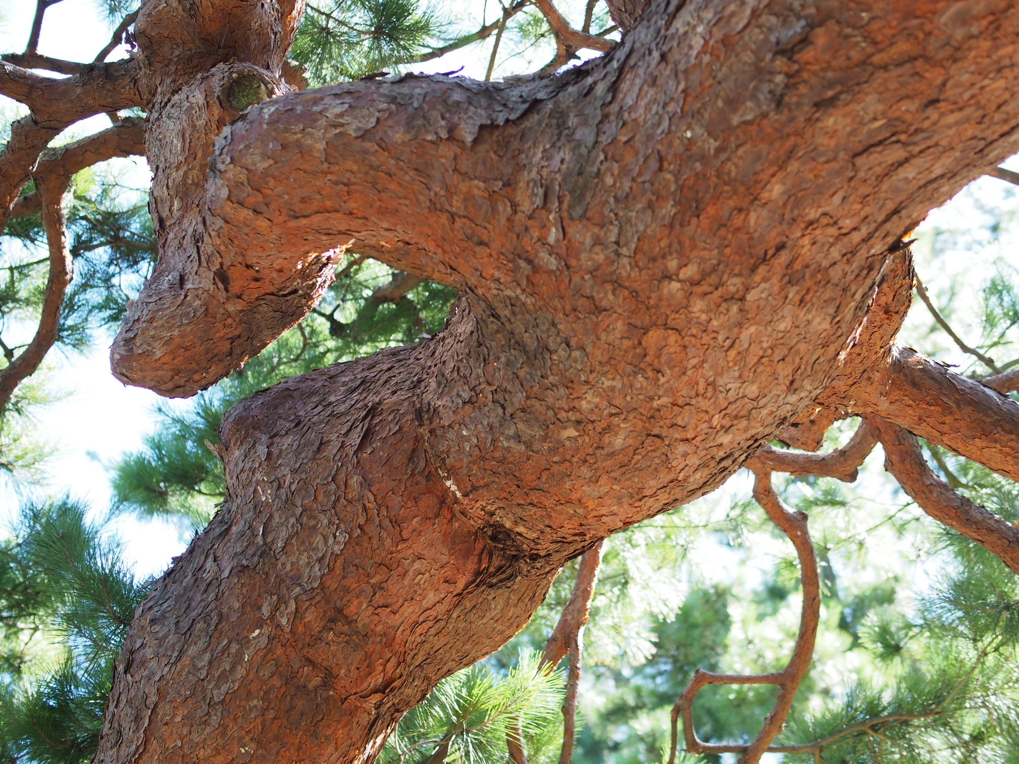 Et j’ai marché, pour savourer ces instants rares et précieux, pour digérer, dans le sens 1er et au figuré, et me voici dans un jardin extraordinaire, en plein centre ville, appelé Ritsurin. Sa création remonte au début de l’ère d’Edo, au milieu du 16ème siècle, il se compose de 6 bassins et de 13 collines artificielles. Il a été occupé comme résidence par des Seigneurs jusqu’à la restauration Meiji vers 1875. Et maintenant, c’est un parc départemental. Certains pins me laissent rêveuse, surtout celui qui me fait de l’ombre maintenant. Il est renforcé par des étais au niveau de ses trois branches. Son tronc est rouge orange comme celui des séquoias californiens sauf que celui-ci, ce n’est pas la hauteur qui l’intéresse ni le fait grimper au ciel, non, c’est l’horizontalité, et ce, sur plusieurs niveaux. Ses racines ressortent de terre et se prolongent jusqu’au bout de ses plus longues branches. Il est le pin majestueux par excellence, quelle présence le bougre ! Son tronc boursouflé supporte la charge grâce au renfort des étais, il se plaît ici, les oiseaux et moi aussi !