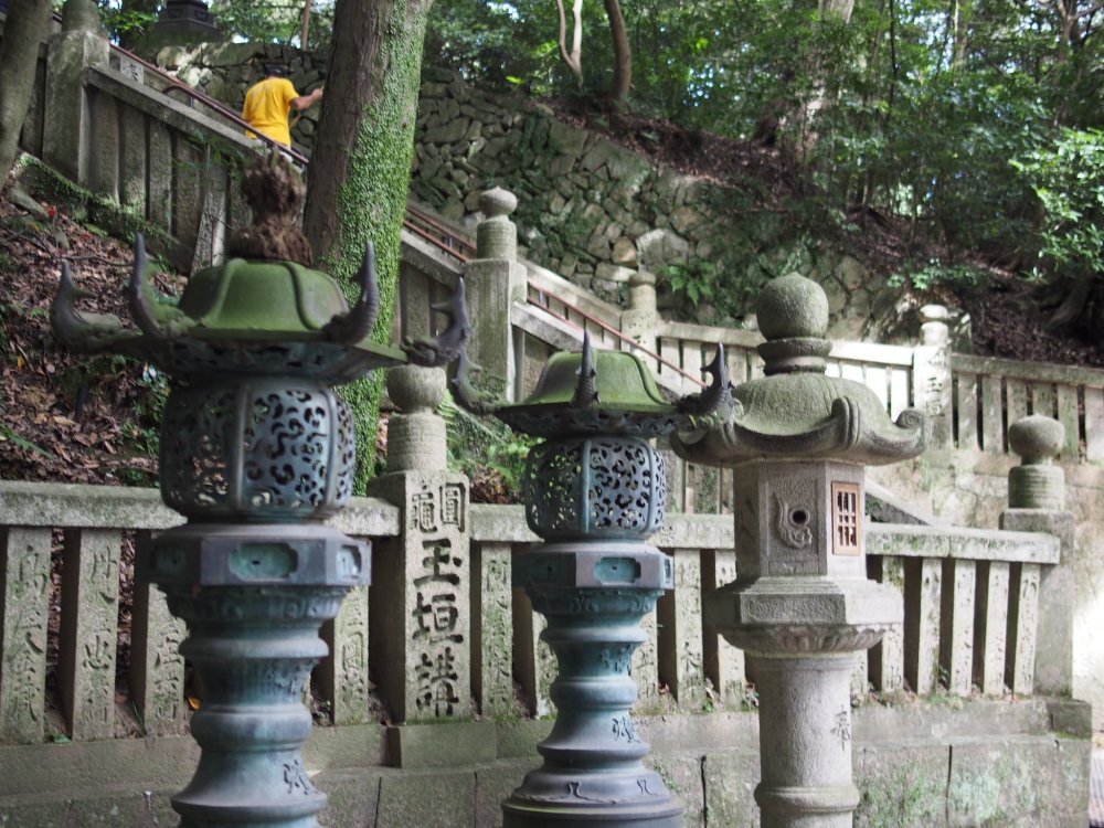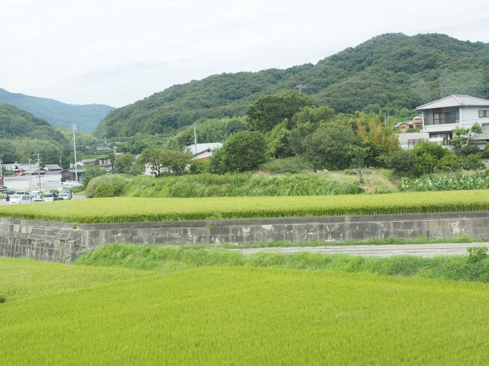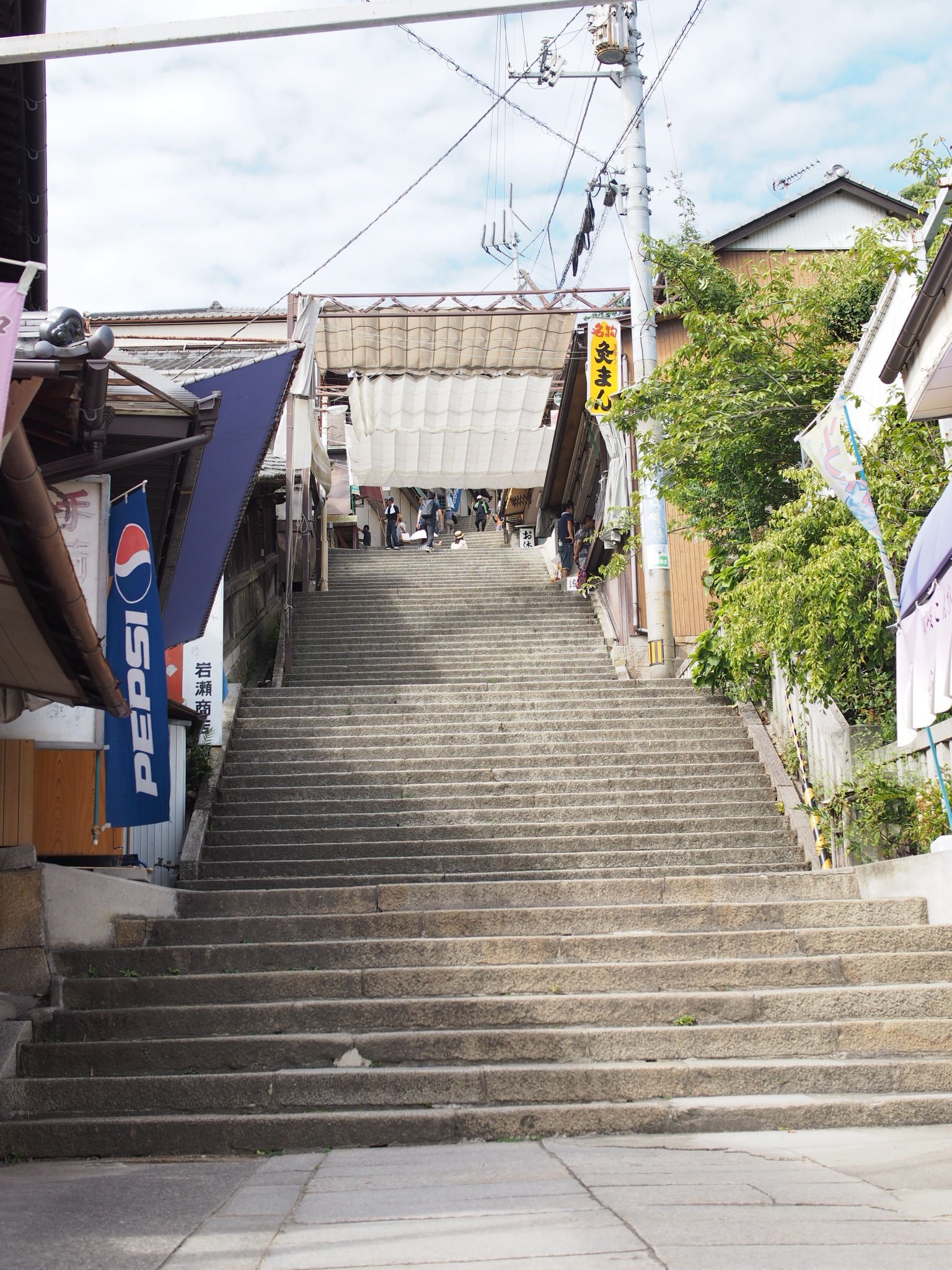 Pour garder le rythme, ce matin, j’ai pris le train jusqu’à Kitohira. Une petite ville où les pèlerins passent pour déposer un don ou un ex voto, au temple, et prier, après l’ascension de plus de 1.300 marches. J’y suis allée de bonne heure, pour profiter de l’ombre avantageuse et de la quiétude inspirée par le lieu. J’avoue que ça tirait un peu sur le souffle au 2/3 du parcours et que je perlais pimpin du front, à grosses gouttes. Heureusement je bois, de l’eau ! Des petits vieux crapahutaient avec un bâton de bambou, ils avaient l’envie et le sourire. J’ai photographié les petites maisons du côté du canal et j’ai repris le train, traversant les rizières.