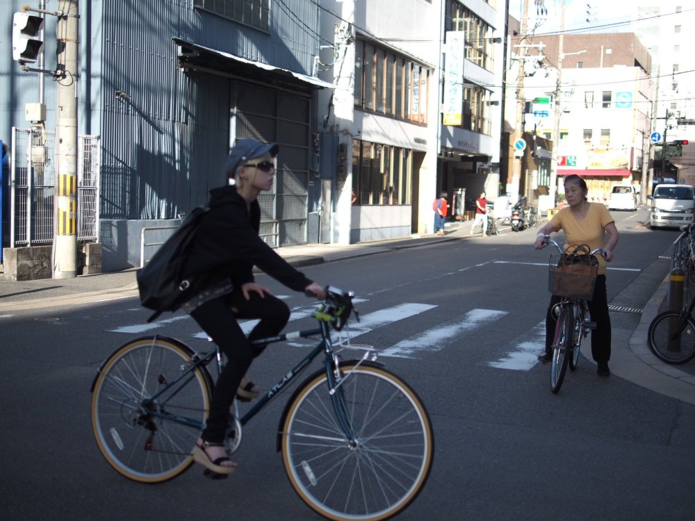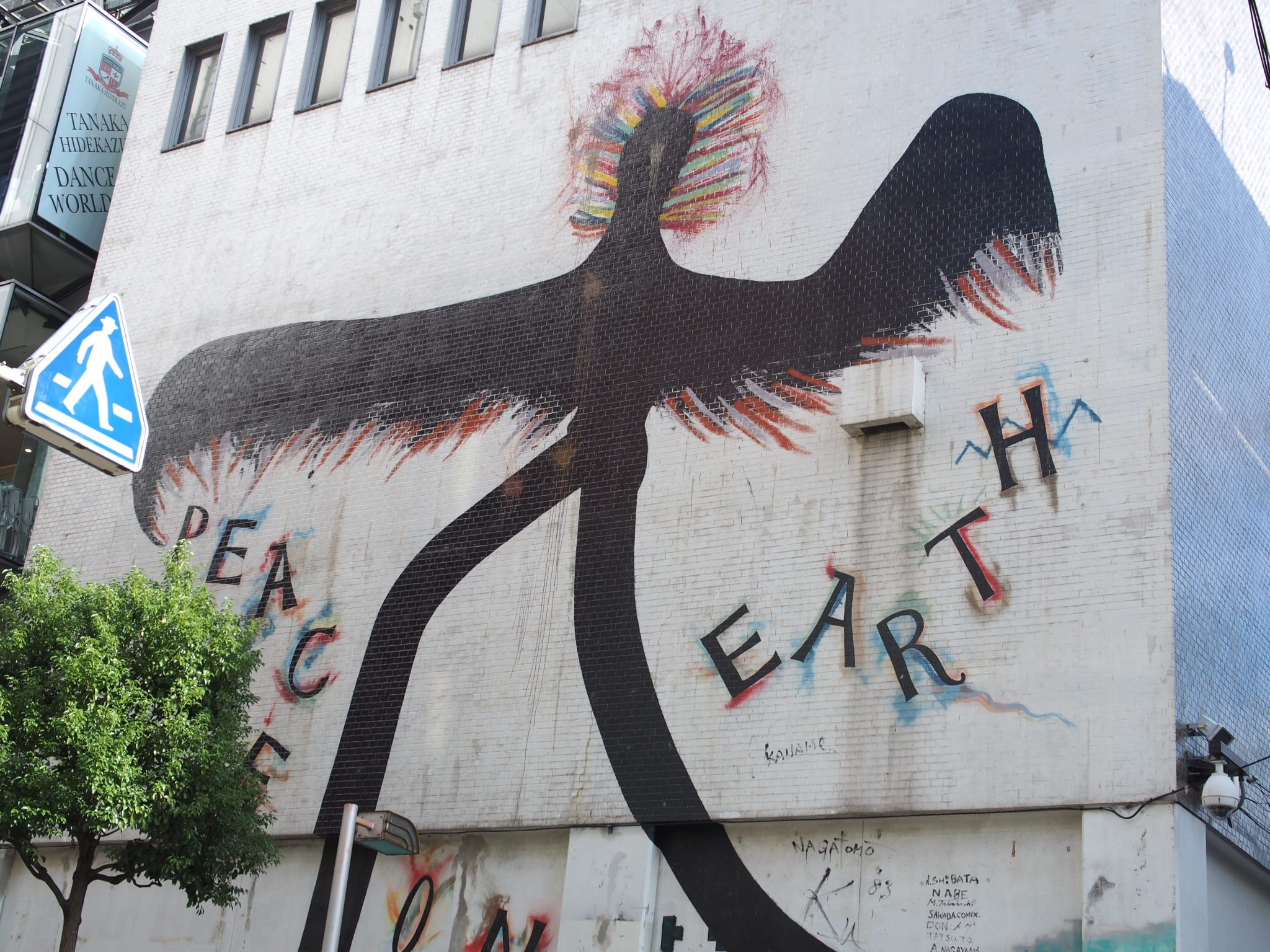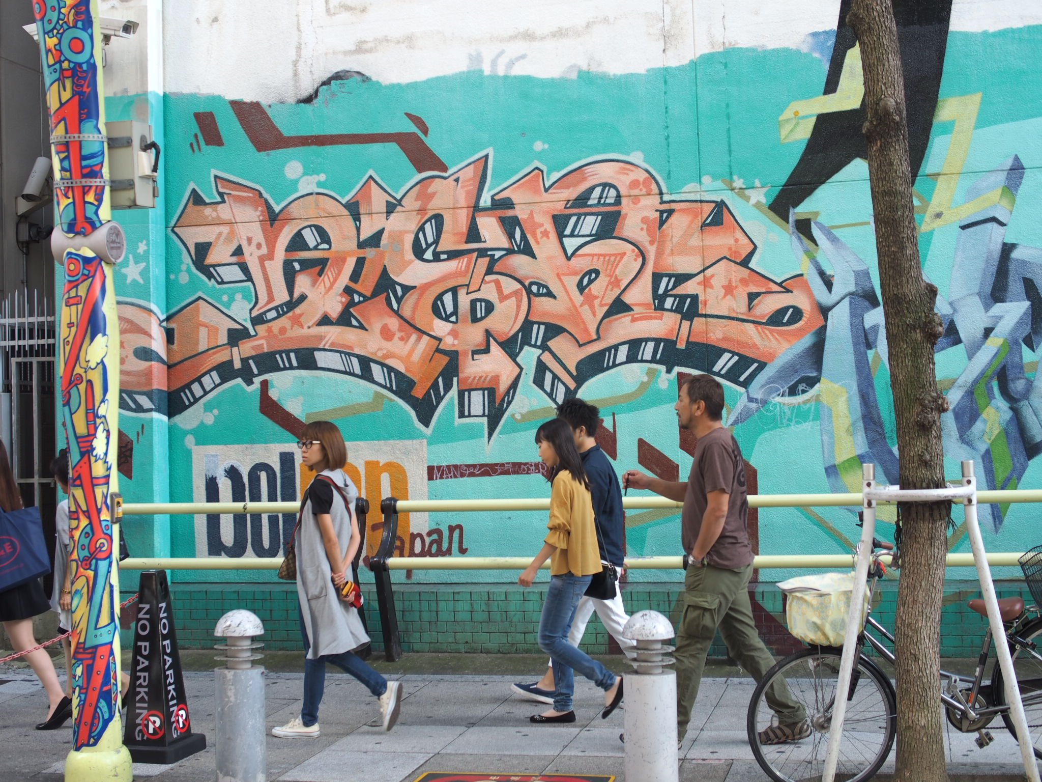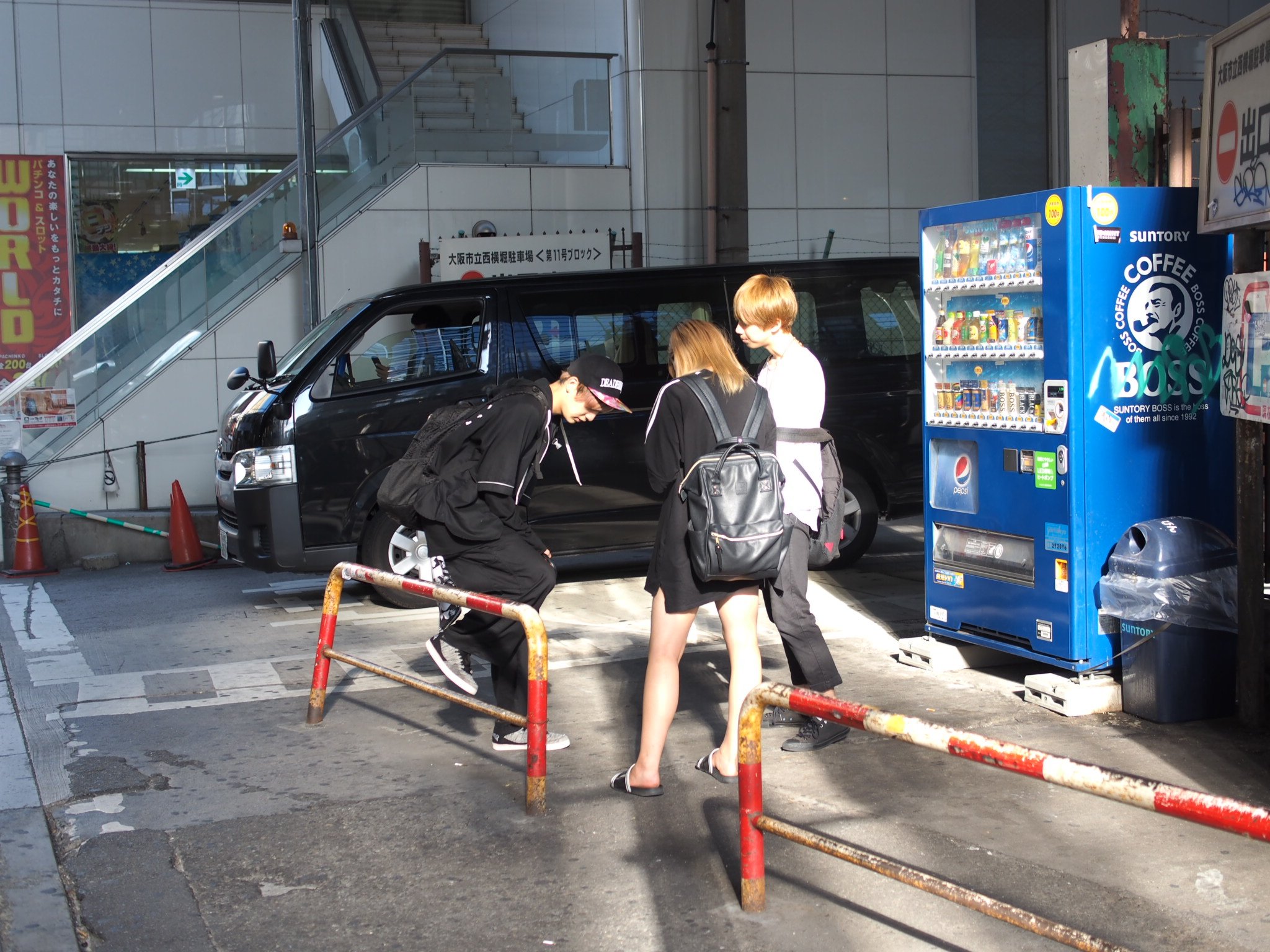 Virée à Osaka, sur le chemin du retour, dans un autre quartier, plus jeune et destroy,, dans lequel je croise une génération en errance ou en déshérence. Je les repère de loin avec leurs cheveux jaunes décolorés, des tatouages sur la parcelle de leur peau disponible. Ils arborent des look grunge, punk… Ils se retrouvent et se rassemblent pour faire du skate ou autre chose.