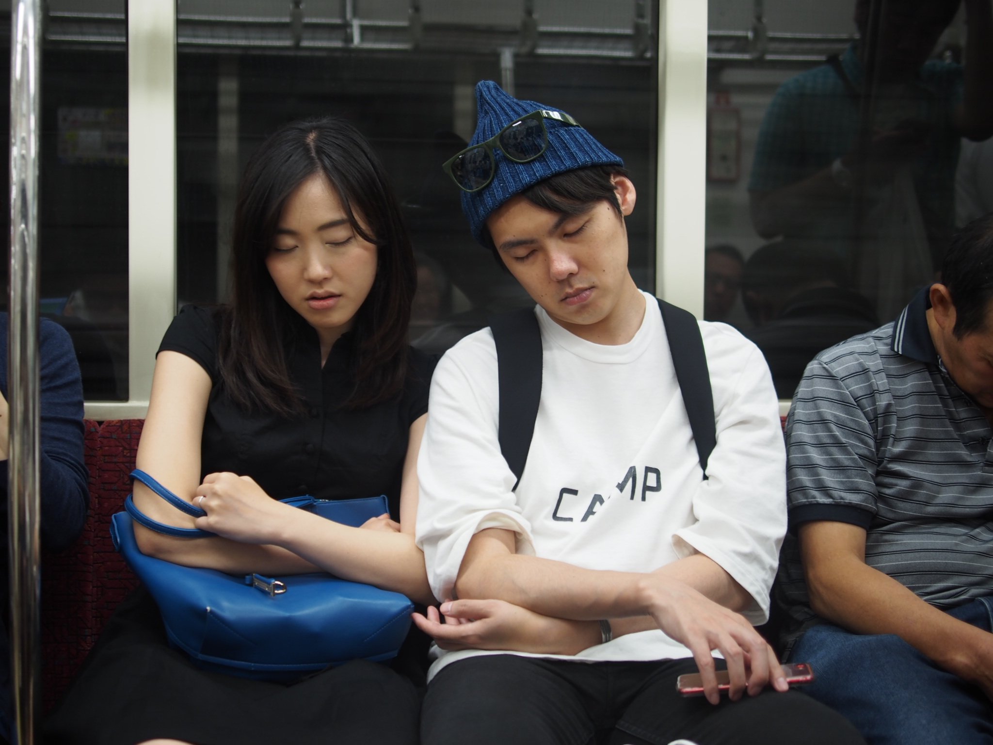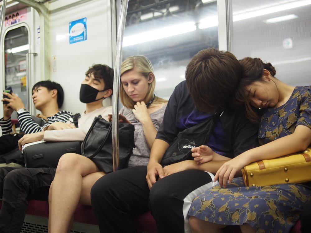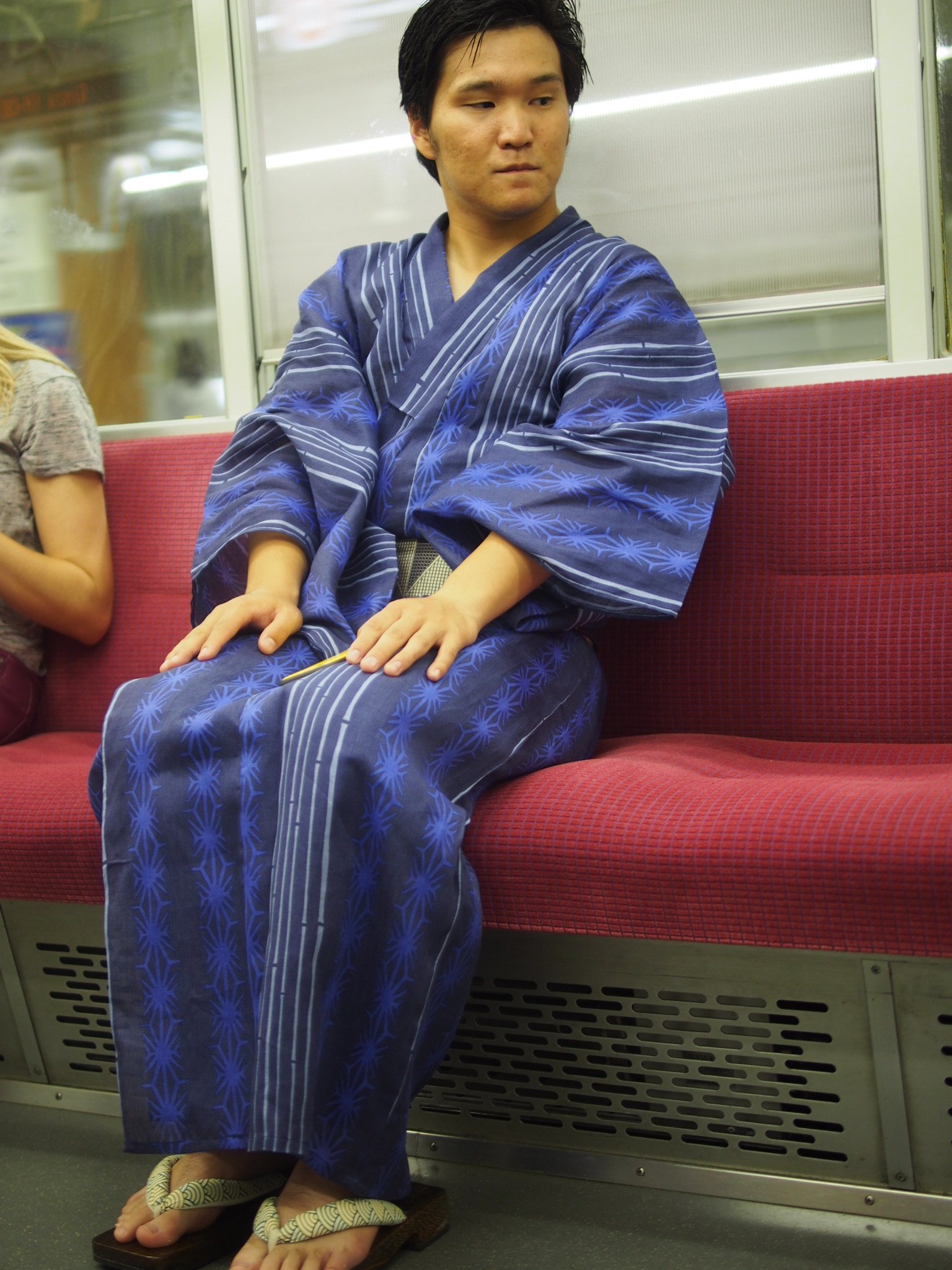 Le métro c’est surtout un festival pour les yeux, ça roupille, après un samedi soir agité. Et c’est l’occasion de sortir en yukata et en geta, d’ailleurs, ici, ça ne dérange personne…