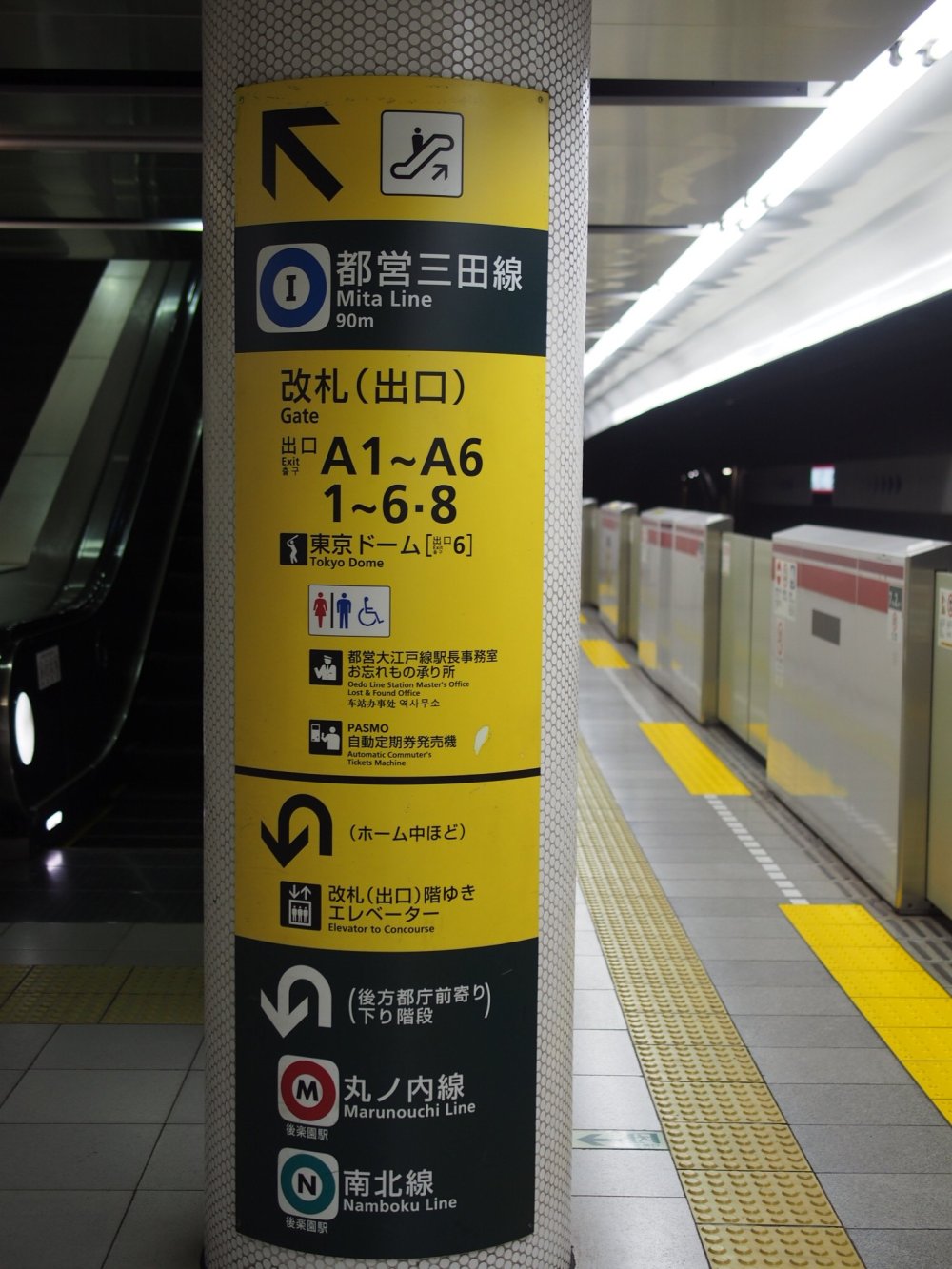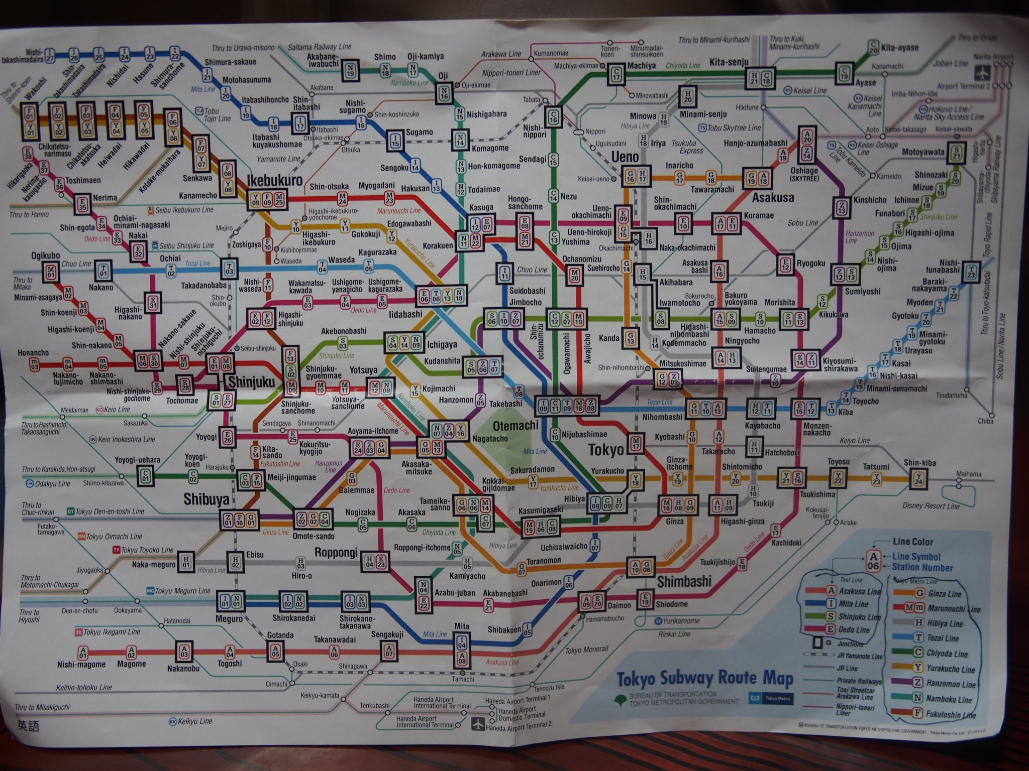 Mais pour circuler, étendre ses ailes d’ange, il convient de comprendre le réseau d’enchevêtrement des lignes du Tokyo Subway Route Map. Tout d’abord, il me paraît nécessaire de savoir distinguer les JR lines, des Tokyo metro lines, des Toei lines. Sinon on met le mauvais ticket dans le tourniquet et ça bip, ou on emprunte l’entrée de couloirs d’une compagnie pour rien desquels on ressort après 10 min de déambulation infructueuses dans un dédale sans trop d’intérêt c’est-à-dire avec beaucoup d’escaliers… Ensuite, il est préférable de rester agile et de passer de l’une à l’autre de ces types de lignes ou sociétés, pour optimiser ses trajets et dans tous les cas, les contrôleurs près des barrières sont adorables et prêts à aider.
