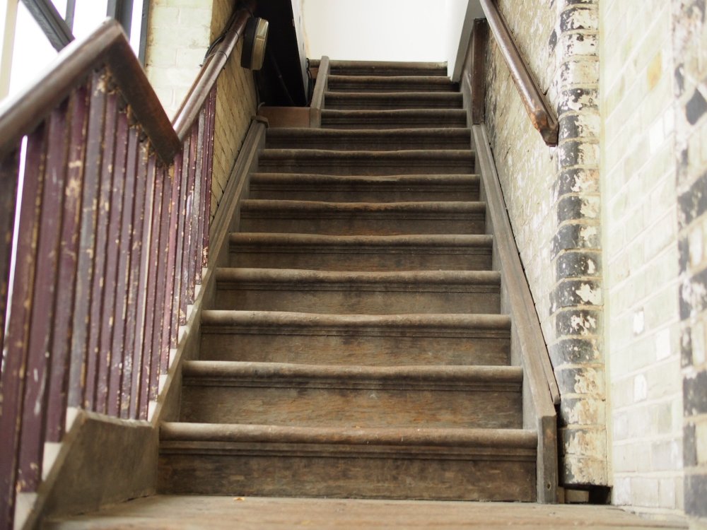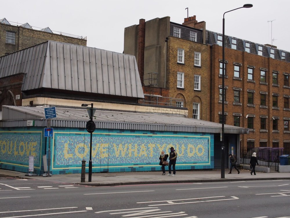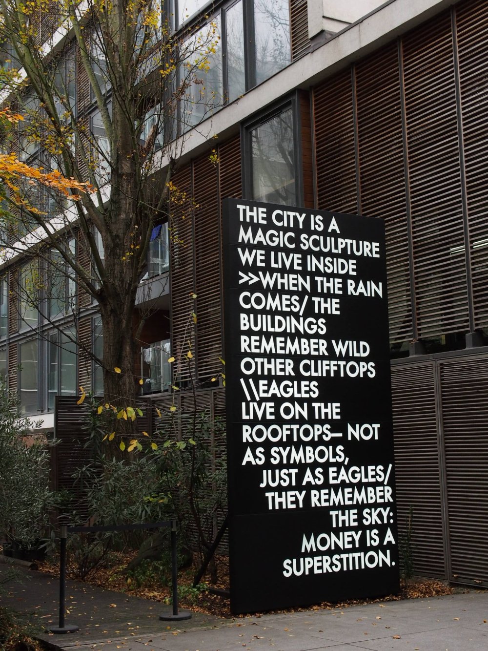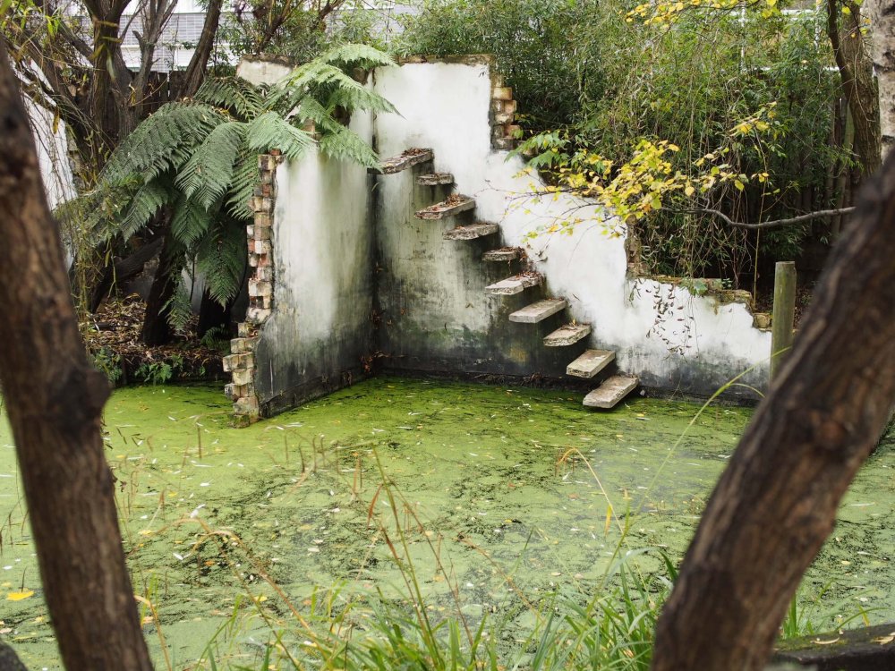 Ce matin, j’ai marché vers la City via Old Street et j’ai marqué un arrêt à la galerie Victoria sur les conseils éclairés de T. L’endroit vaut le détour, les accrochages ne m’ont pas saisi l’œil. Les ruines et les lentilles d’eau sont visibles depuis l’arrière cour de la galerie. La hauteur sous plafond, la structure en acier et l’escalier laissent à penser que cet endroit est un ancien site industriel.