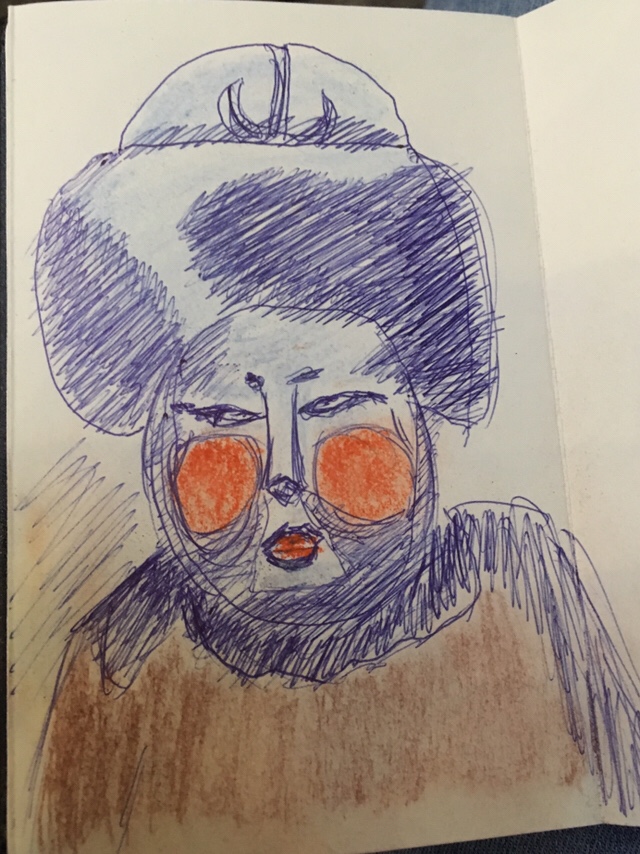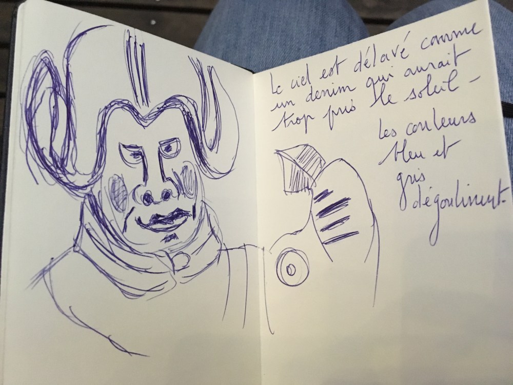 Il est doux de s’aventurer ailleurs, sans référence, ni repères. J’ai aimé dessiner dans l’avion, au bic ou avec le smartphone. A l’auberge j’ai rajouté trois couleurs de pastel pour colorer le portrait réalisé à partir d’une photo.