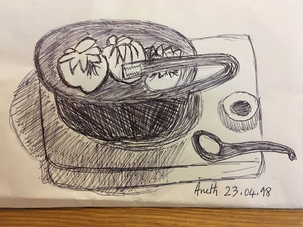 PS : dans un centre commercial, attendant que la pluie cesse, je dessine des raviolis vapeurs, l’estomac en fleur.