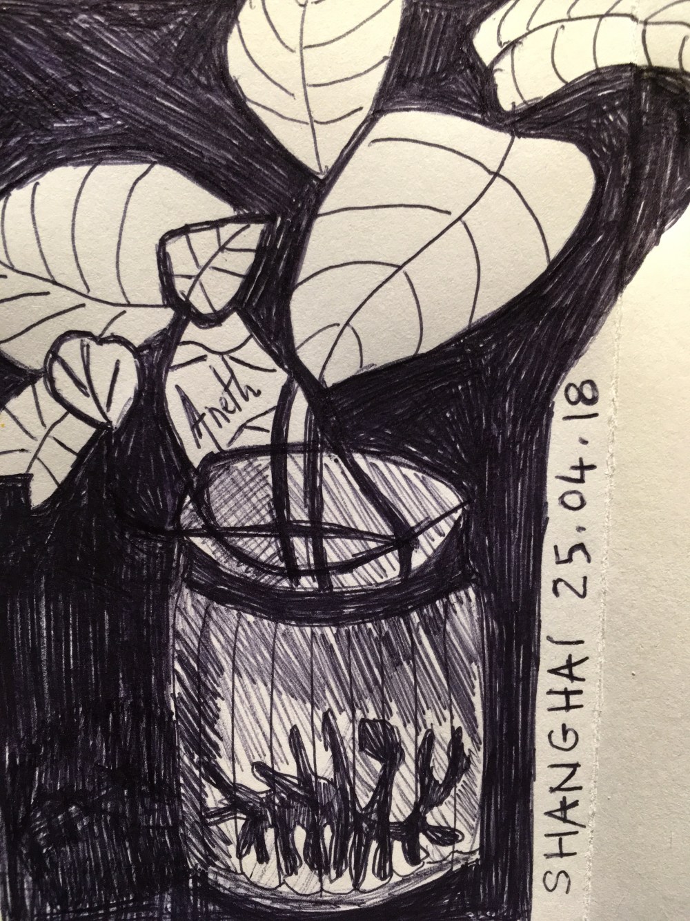 Un dernier dessin pour la route, pour me souvenir des plantes et des fleurs croisées dans la journée. C’est l’heure des pensées, éveillées, bientôt absorbées par les rêves.