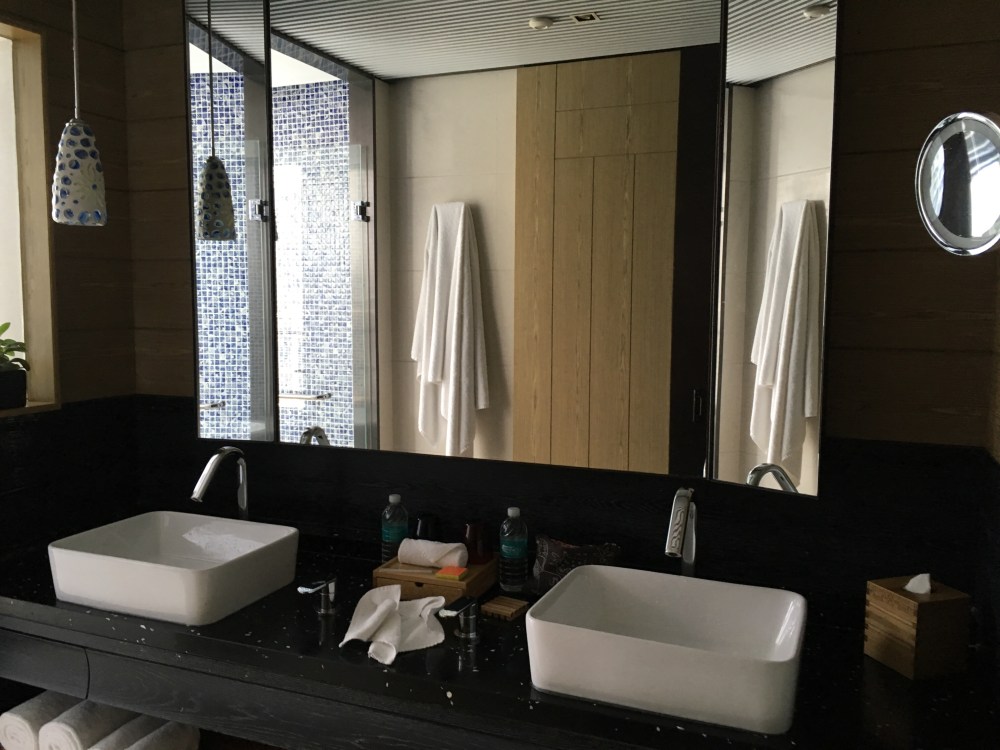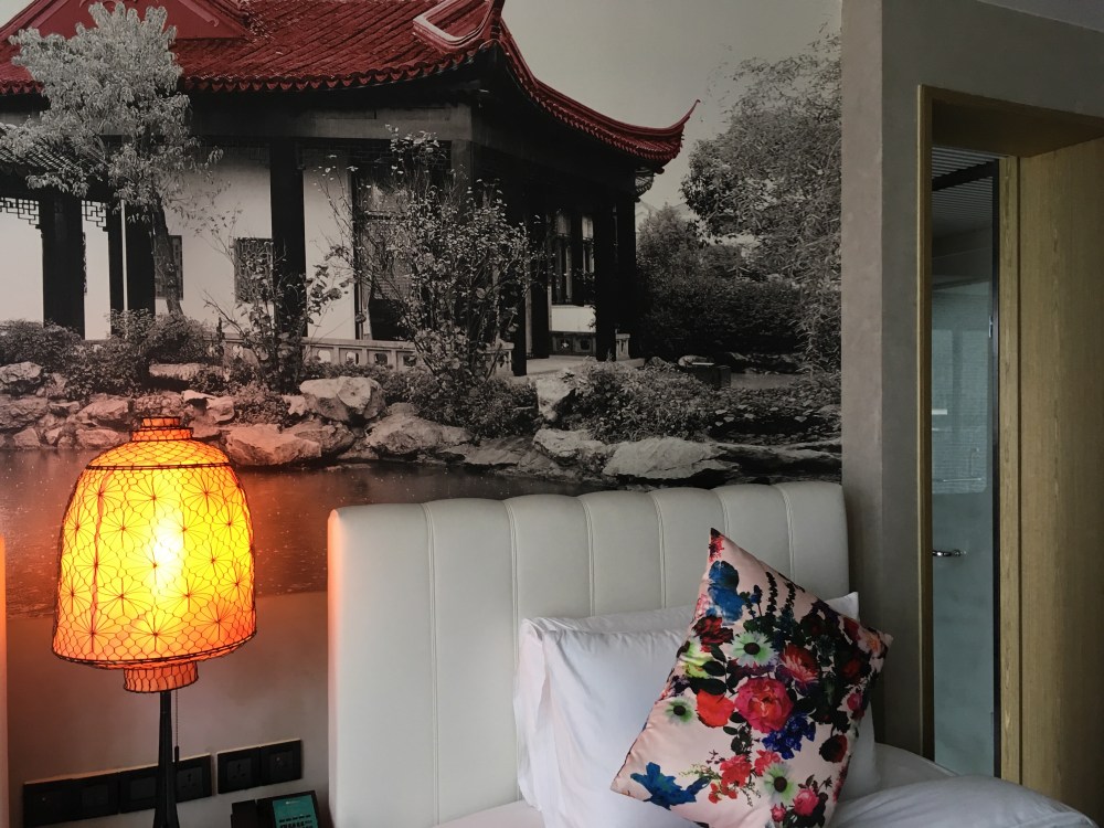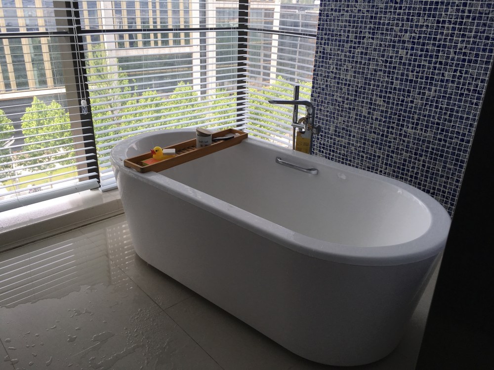 Pas de vue sur le Yu garden mais sur deux arbres qui se battent en duel et la rue très bruyante qui longe le Bund immaculé d’immeubles, je respire longuement et je prends mes sels ! Après quelques percées d’oxygène dans mon cerveau très carbonisé, je relativise car ma chambre est plus que confortable, elle se compose de deux queen beds et d’une baignoire en terrasse avec des petits carreaux bleus magnifiques et…d’un double lavabos, d’une douche et surtout d’un petit coin avec ordinateur de bord ! Je vais tester les multiples fonctions et je vous ferai part d’un rex argumenté. En attendant rien et tout, je me suis préparée un thé vert et un bain qui furent divins.
