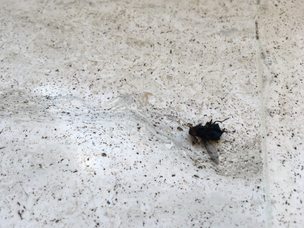 Dans une mare de sang, une mouche s’étend, sans bruit.