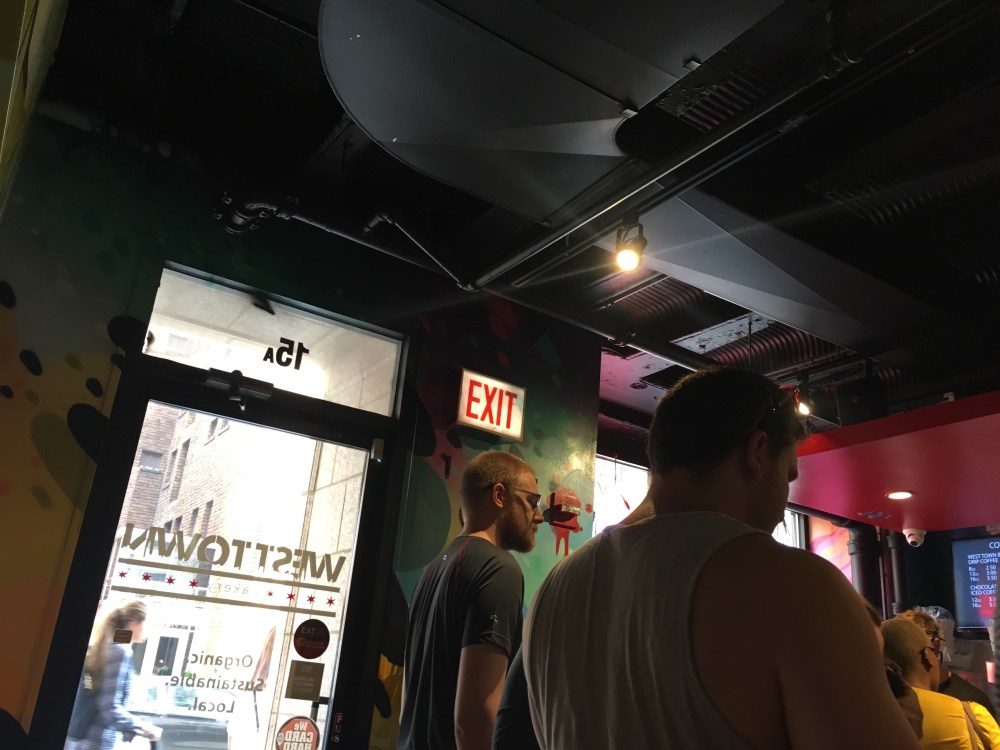 Tous les matins, je vis un rituel tranquille. Éveils en cascades tout d’abord à 2h après un cycle de sommeil, puis je me rendors, jusqu’à 6h et j’écrase à nouveau jusque vers 8h. Je lis, je ferme les yeux, je lis éclairée par une grosse lampe bleue. Je me lave et m’habille et je prends l’ascenseur pour descendre mes 6 étages direction West Town Bakery qui se situe au même étage que le lobby de l’hôtel ACME.