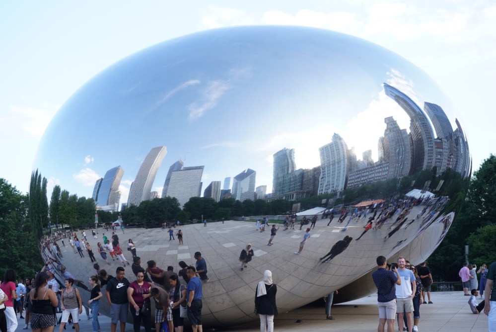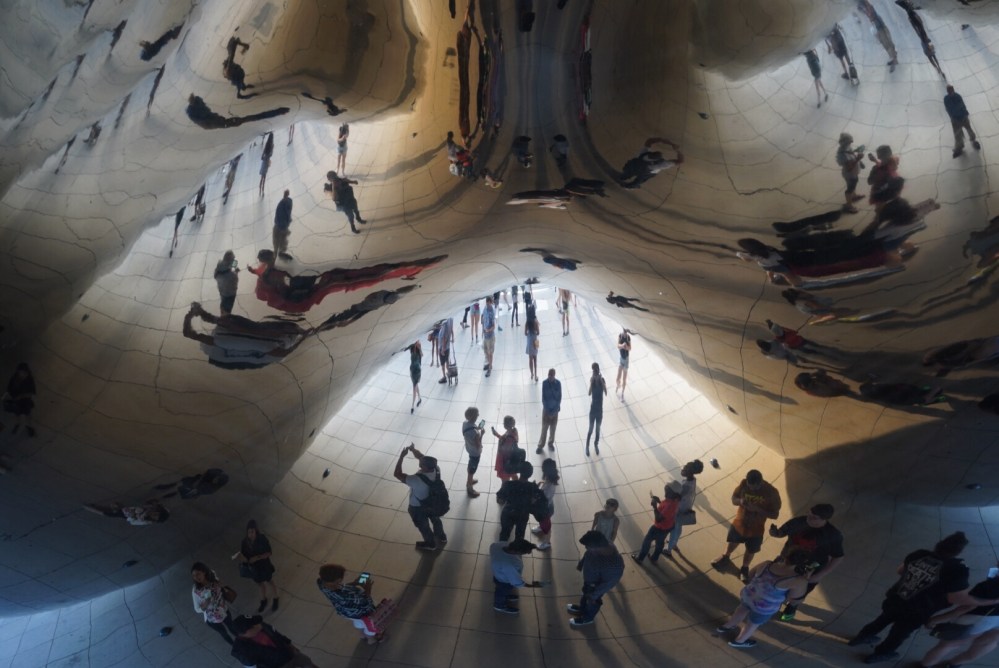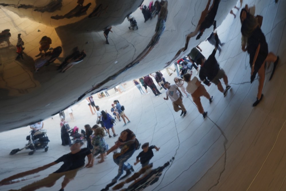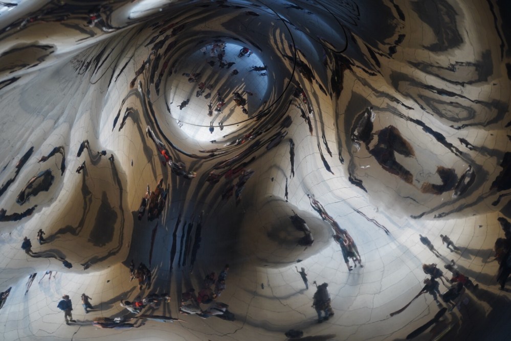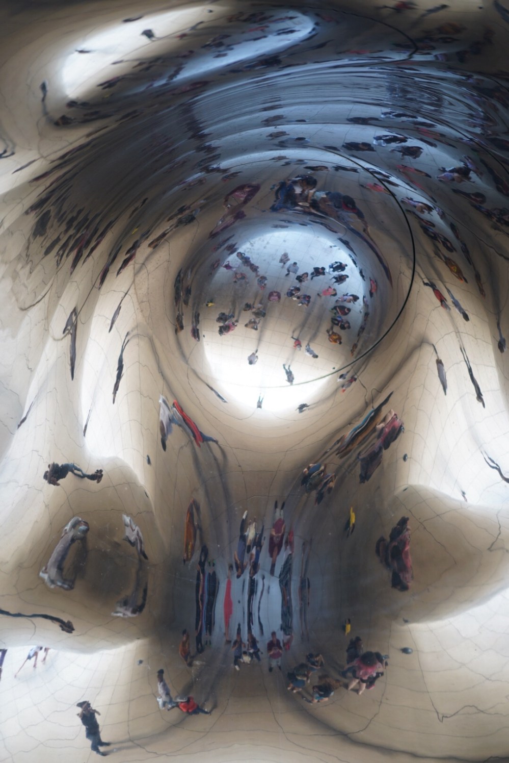 « The Cloud Gate » surnommé « the Bean » œuvre d’Anish Kapoor située dans Millenium Park, l’attraction numéro 1. On en fait le tour, et puis le spectacle est encore plus dingue dessous, car l’image est anamorphosée et diffractée à l’infini…
