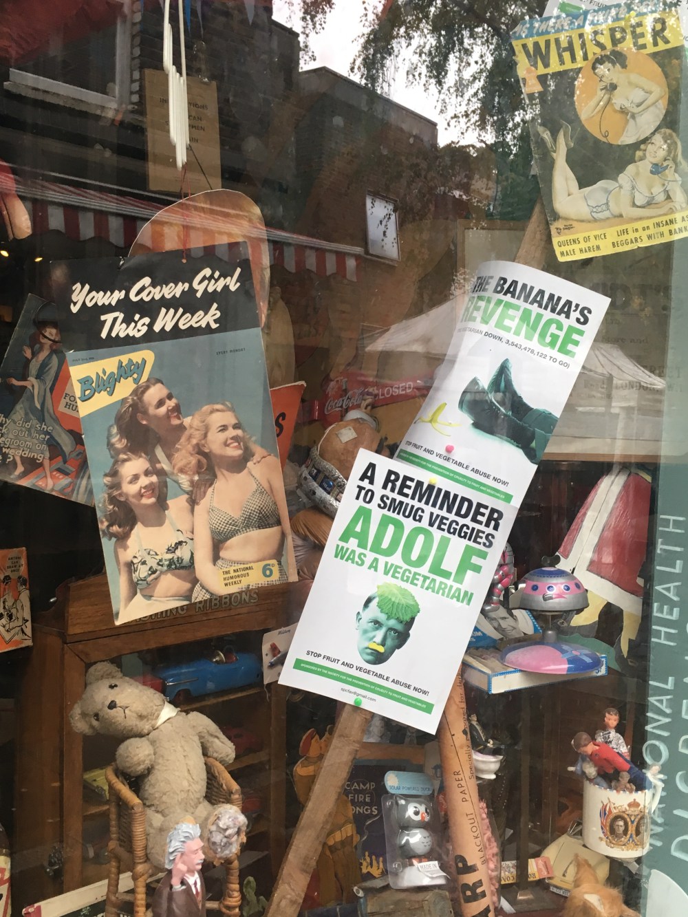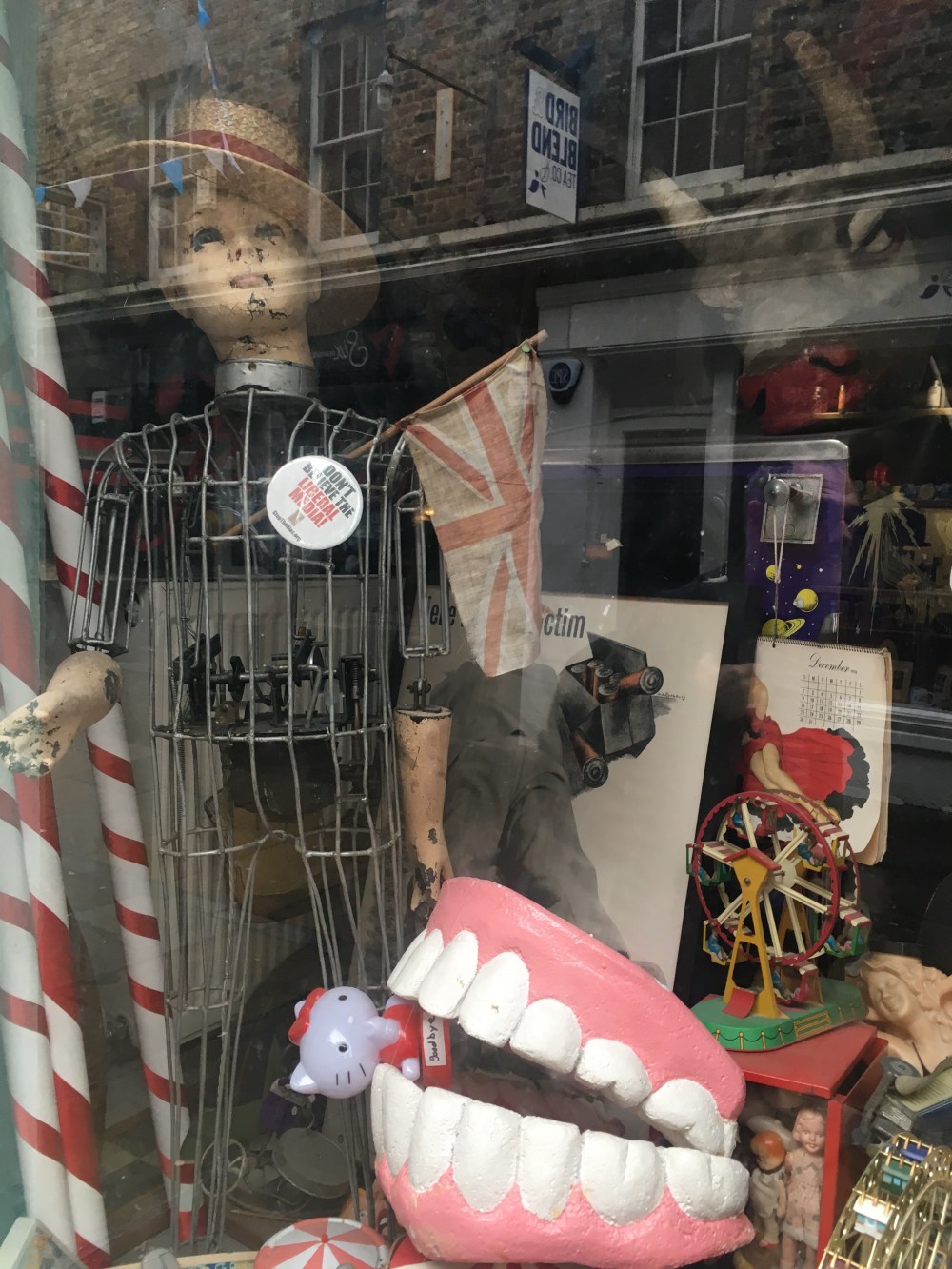 Promenade sous la pluie dans Islington depuis la pension, nous sortons sur la gauche et rejoignons un quartier marchand animé et populaire, et traversons le marché de « Nags Head », proposant des fripes de marques plus ou moins fameuses telles que Burberry et tous les biens de première nécessité. Il pleut et les voitures décapotables sont de sortie … Nous prenons le bus direction le quartier d’Angel en suivant Upper Street, toujours dans Islington, nous descendons à Islington Town Hall. T. y va pour chiner, c’est beaucoup plus bobo que là où on dort.