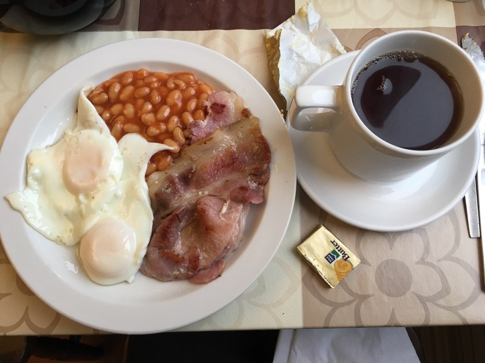 Petit déjeuner anglais à la pension, œufs sur le plat, lard, champignons et beans pour ceux qui le veulent, du pain complet grillé sans oublier le thé bien noir. La vue de la salle à manger donne sur la rue, il bruine. Assurément, hier, nous avons bien fait d’en profiter.