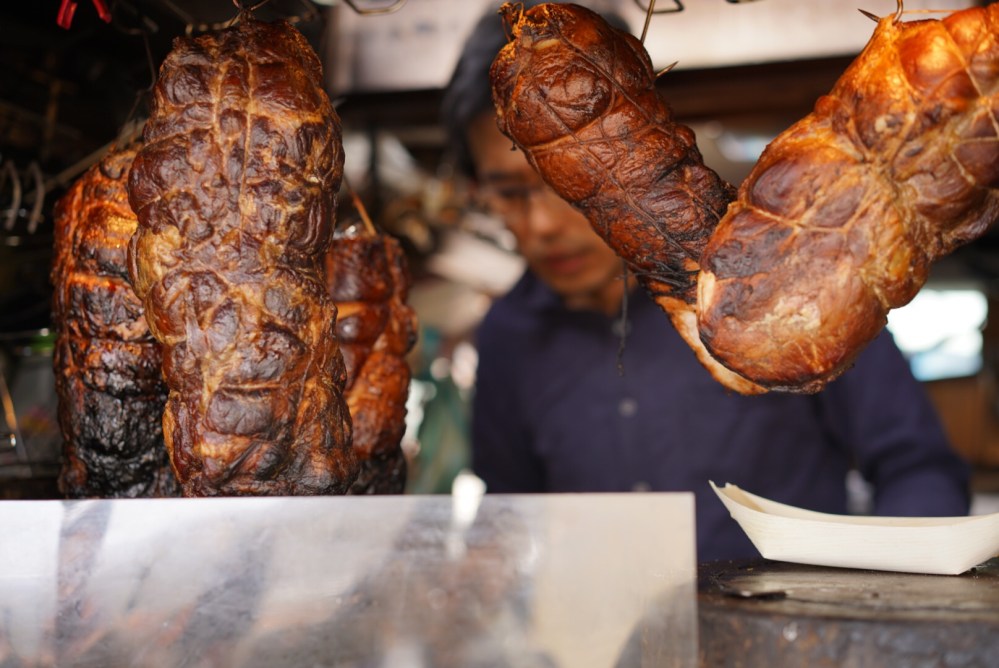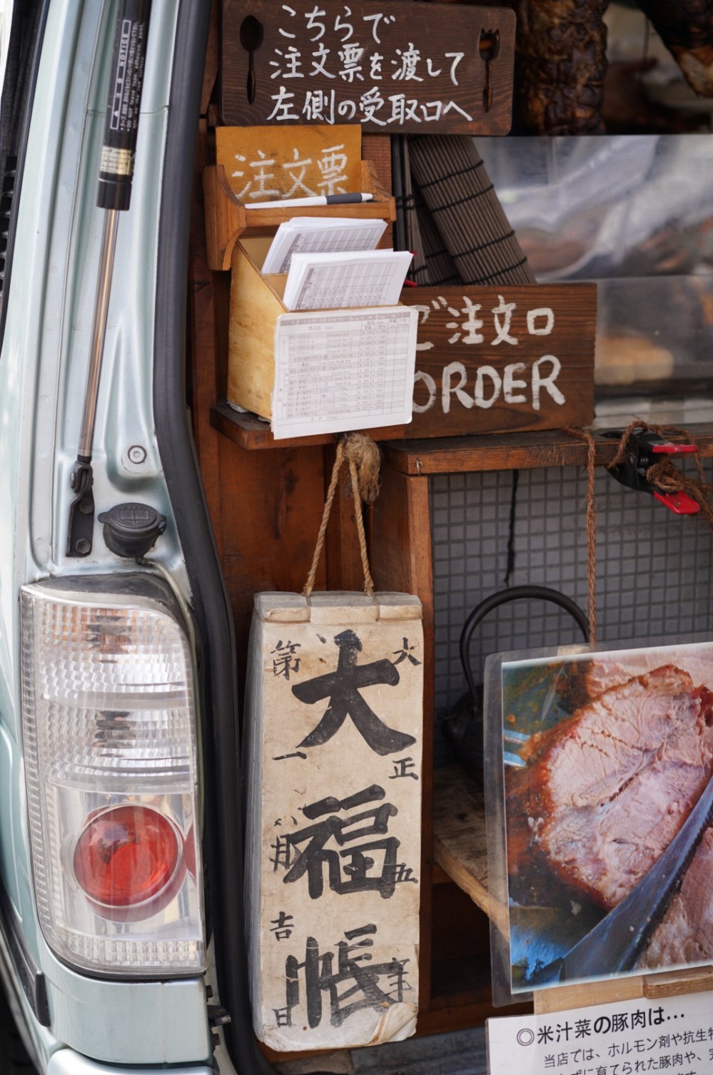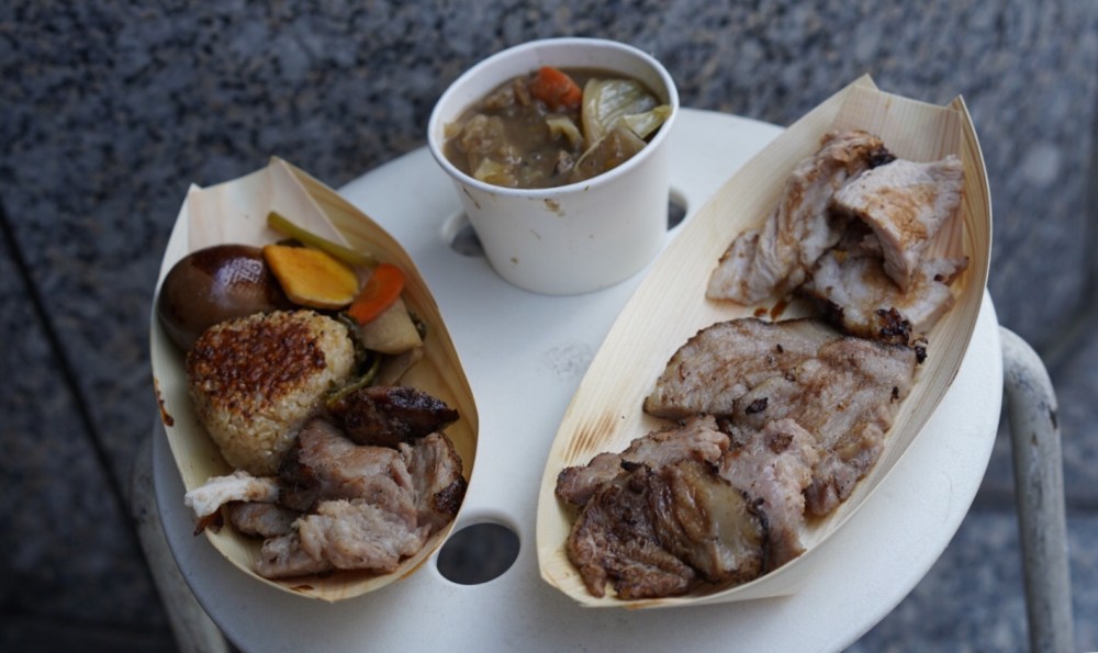 PS : le food truck tenu par un quadragénaire genre ex consultant dans la finance ou l’IT proposait que du très bon. Presqu’une heure de queue, et au moment de payer comme il ne prenait pas la CB et que je n’avais pas de cash, j’ai couru vers le Family Mart et je suis revenue comme une trombe, et of course, il m’a servi illico. Dans sa barquette, il proposait un œuf tiède dur et braisé à l’extérieur et liquide à l’intérieur, une boule de riz légèrement compacte et croquante, et du porc grillé, de l’épaule et du jarret, c’était à tomber, je ne m’en remets pas. Certes sa soupe de navets au bouillon de porc tenait au corps. Mais les petits légumes qui accompagnaient son set étaient cuits al dente, un délice. Le prix de l’ensemble était plus que convenable. 2000 yens environ 16€.