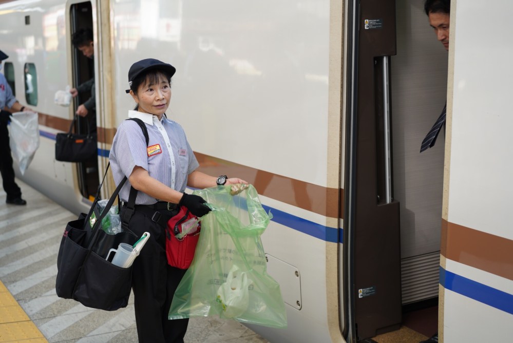 Tous les quart d’heure à cet horaire, les trains défilent, dans les deux sens, ils se vident et se remplissent en 2 min et pendant 10 min les femmes de ménage nettoient, une par wagon et les sièges automatiquement pivotent et changent de sens car dans un shinkansen tout le monde voyage dans le sens de la marche. J’allais oublier qu’une sorte de surveillant avec un bâton de gendarme donne le signal pour monter dans les wagons.