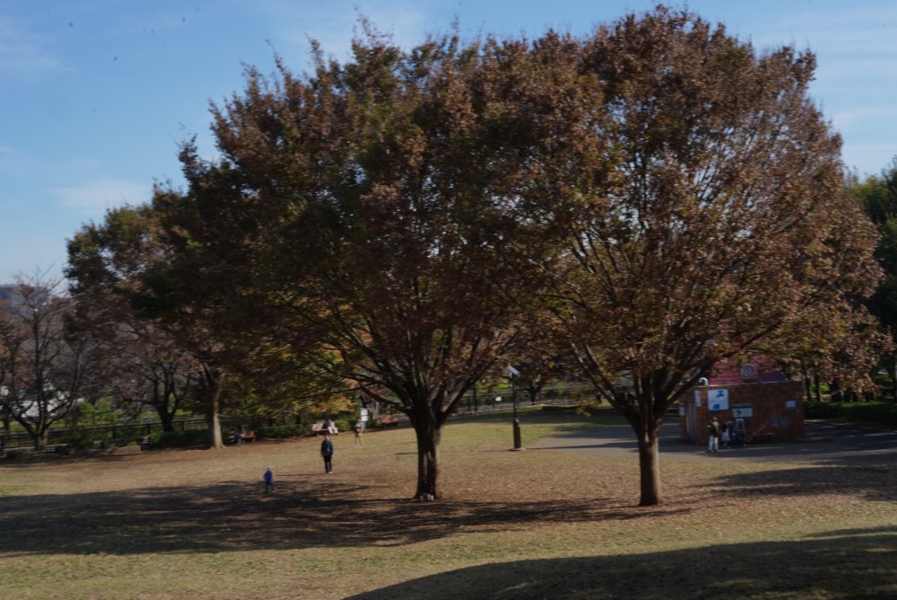 Bain de soleil, de verdure, et chants d’oiseaux et d’enfants qui rient ou qui pleurent, dans ce nouvel environnement je me repose, sur des pierres, à Shishogaya Park en banlieue de Tokyo tout près de l’Université. Depuis la gare ferroviaire de Shinjuku, j’ai pris un train jusqu’à Seijogakuen-Mae, pendant plus d’1/2h. Ça s’est bien passé, c’est un autre rythme que la mégalopole comme en région parisienne. Ça sent la campagne, les vélos sont légion, les familles sortent ensemble, on répare ou on balaie les feuilles mortes devant les maisons, on prend le temps de vivre. Ils voient peu de touristes dans ce quartier résidentiel plutôt huppé situé au sud ouest de Tokyo en direction de Yokohama. C’est drôle tout à l’heure une femme emmenait un groupe de japonais et leur commentait les différents arbres du parc, leurs caractéristiques, les feuilles.