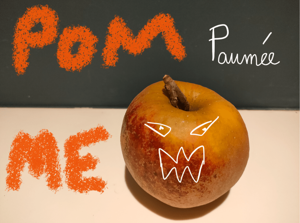 C’est l’histoire d’une pomme normande, mi-frog mi-rosbeef, plus « in » qu’exit, un fruit monde paumé, né à la campagne, au coeur des vergers, rêvant d’une vie compotée à la capitale. A peine sortie de la manche de Miss P, the Jam Gardener, la voilà dans la poche d’Aneth ciboulette, prête à bondir comme une balle sur le bitume. Pom pense à l’écriture de ce court poème, à sa variété rare, qui rappelle le goût acidulé des choses et des êtres. Sans dépit Pom Q the Queen is d’Happy !