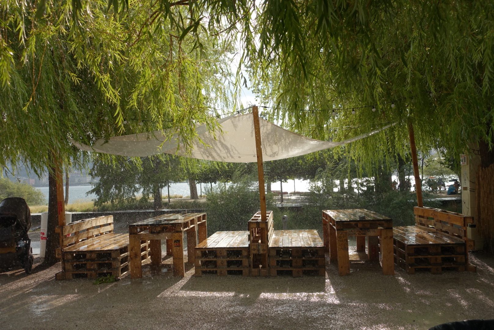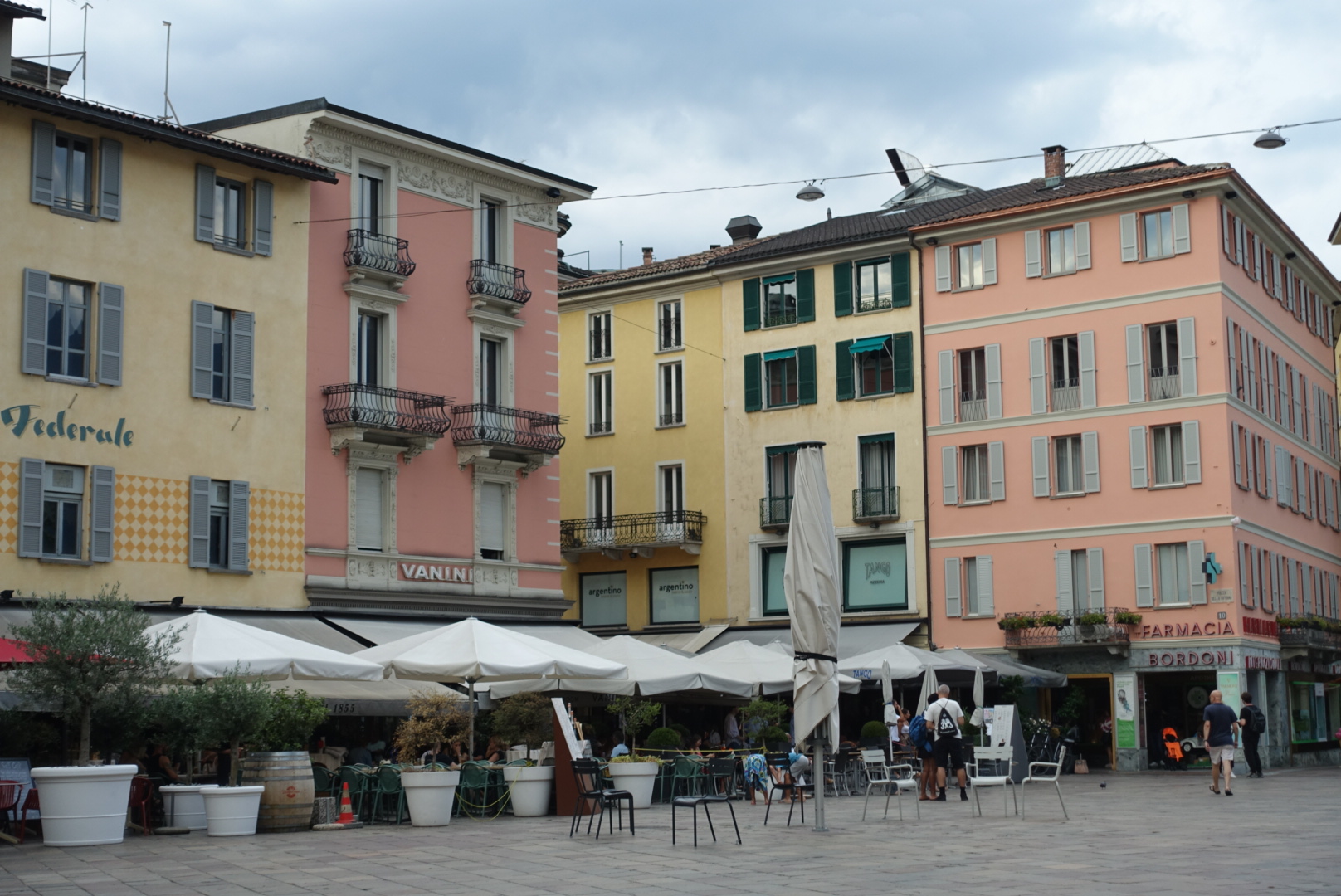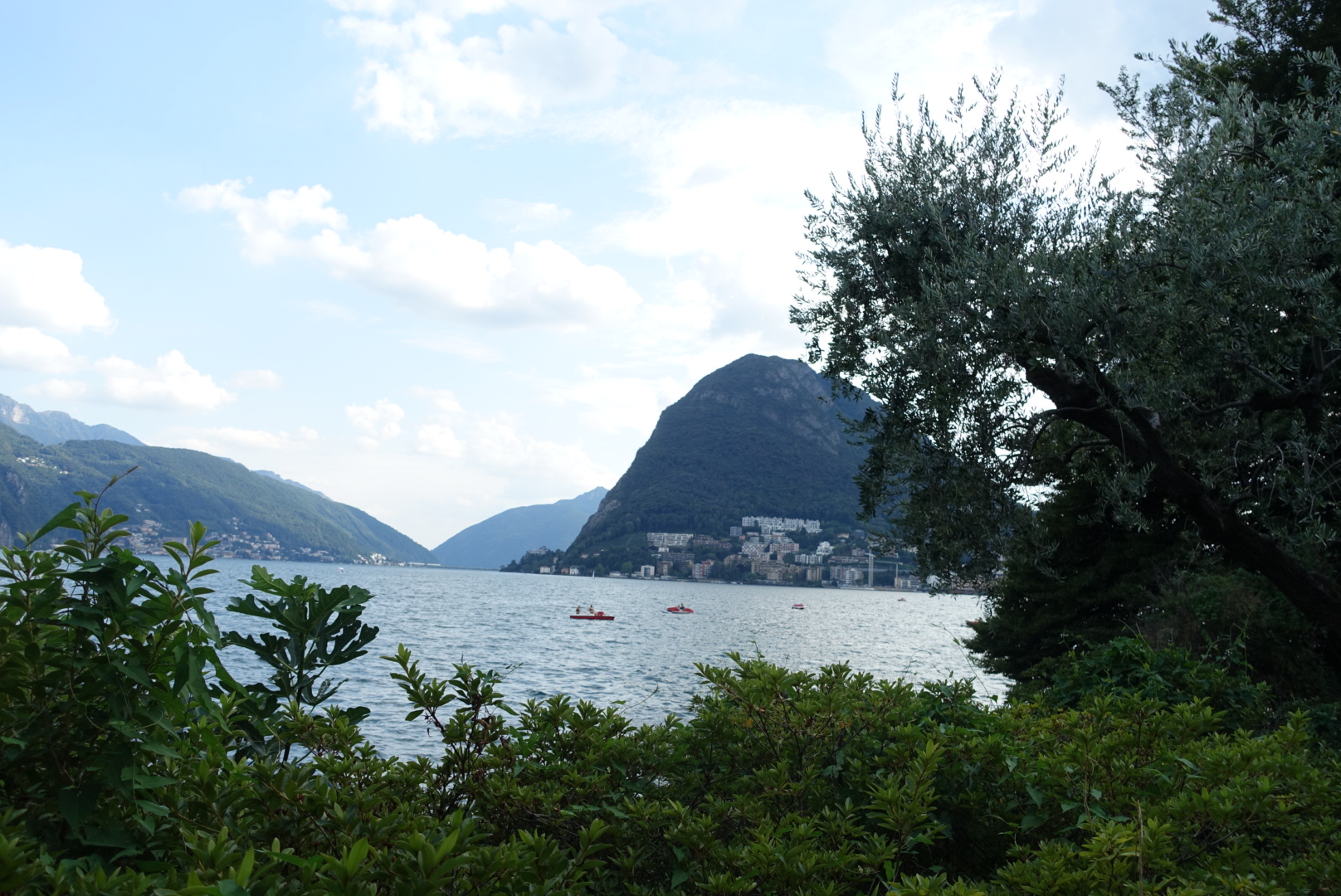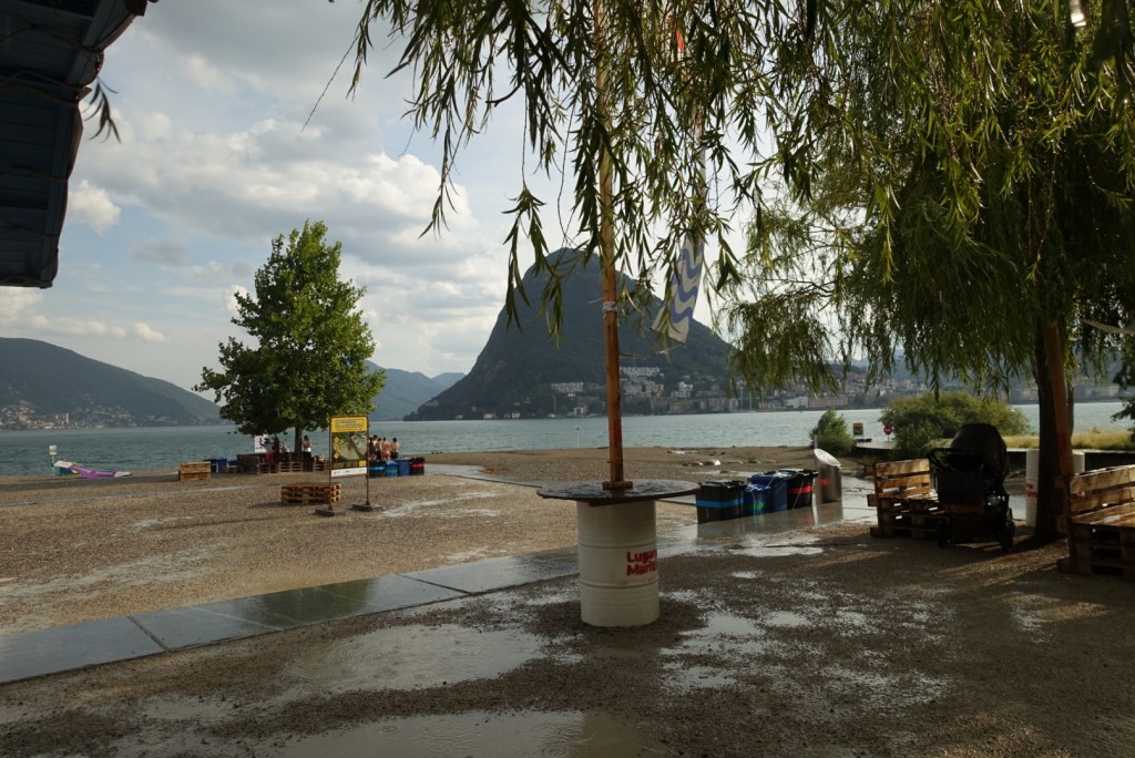Pour m’acclimater à Lugano, je suis allée musarder du côté du Parco Ciani quand il s’est mis à pleuvoir des trombes d’eau. De la petite plage qui précède un port de plaisance, « le pain de sucre » (version miniature de Rio) semblait fondre à vue d’oeil. Après un certain temps, nous, les gens d’ici et de passage, sommes sortis de nos abris de fortune. J’ai ressorti mon museau, l’idée étant de visiter le centre historique et rebelote, les gouttes sont revenues, de vraies douches à l’italienne… L’eau ruisselle, les flaques font flip flop et pourtant je ne chante pas ! Bien heureusement les arcades couvrent nombre de rues ce qui m’autorise un moment de pause après la dégustation de parts de pizza chez Staglio, un endroit recommandable. Quant à mes ongles de pied, ils sont en train de perdre leur jolie peinture semi-permanente. Rien ne dure sauf les orages qui s’enchaînent et se déchaînent. La morale de ce soir c’est que la pluie fait des claquettes, le spectacle est dans la nature (et un peu dans la mienne) et que je commence à grelotter…
