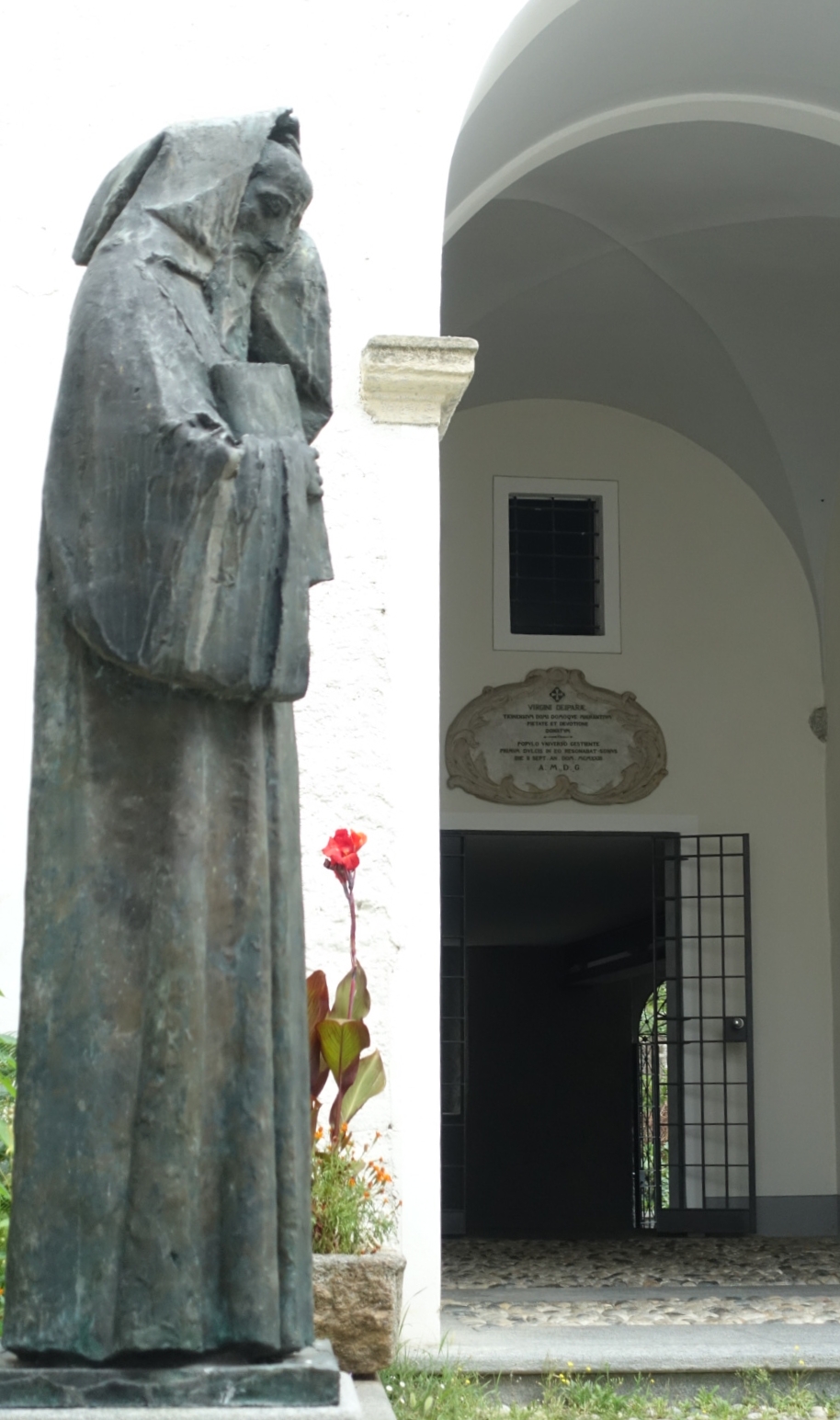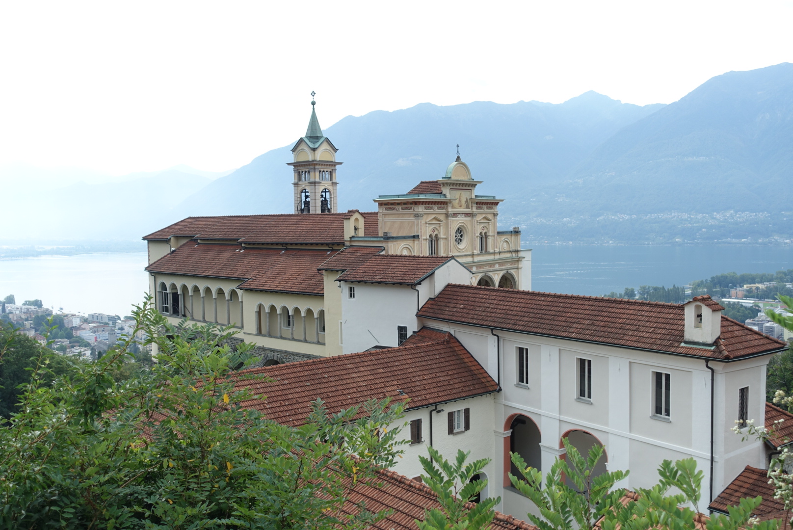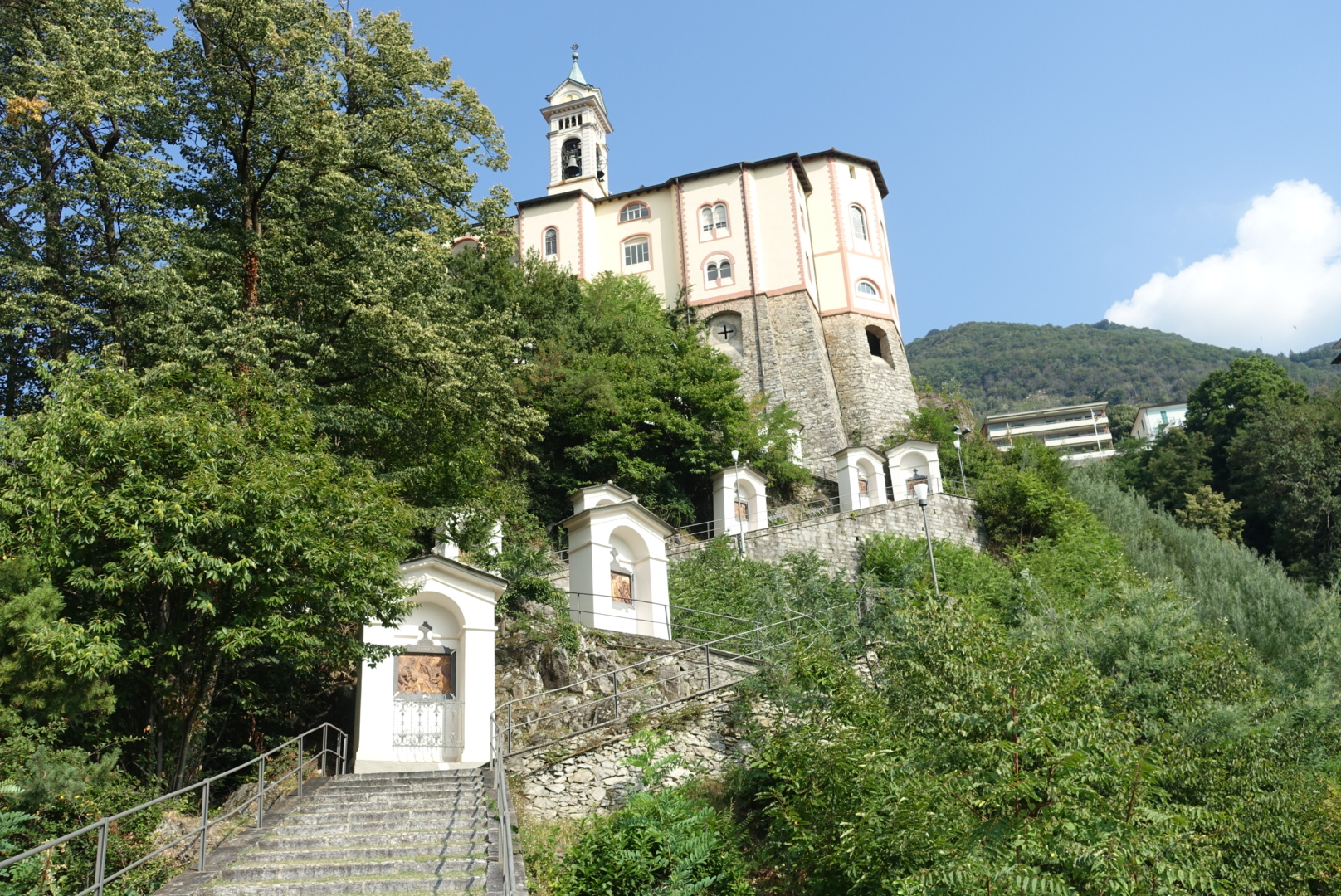 Ce matin, je suis montée avec mes jambes peu musclées pour visiter la basilique, le monastère et le chemin de croix de la Madonna Del Sasso qui sont aussi accessibles depuis Locarno par un funiculaire. Sur le piton rocheux, un moine franciscain du 15eme siècle aurait vu la Vierge la veille de l’Ascension. De là, une église, un monastère…ont été construits par le moine et nombre de compagnons pour célébrer cette apparition et depuis, cet ensemble religieux s’apparente à un lieu de pèlerinage en particulier à approche de l’Assomption.