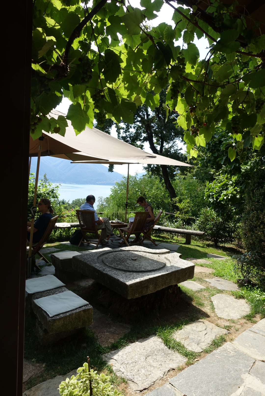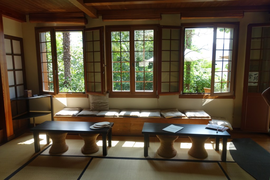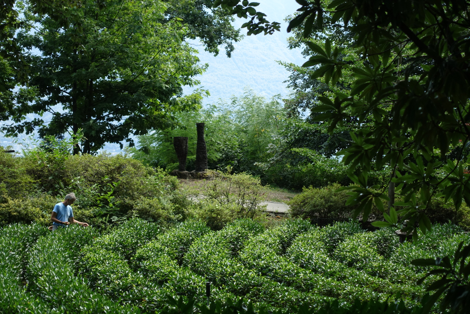 Ce matin, petit passage par la Poste de Lugano, le deuxième du séjour. Il y fait frais et les timbres ne sont vendus bizarrement qu’ici, j’aurais préféré chez les chocolatiers. Le personnel est souriant, et accueillant, « bonjour » naturel en italien puis on se présente et la langue bascule vers le français ! Je suis invitée à me rendre au comptoir spécial pour les envois de courrier, et pour le choix du timbre, le grand livre s’ouvre sur une petite abeille qui butine,…Et, nous voilà connectés. C’est alors qu’après avoir raconté que j’avais adoré l’Expo sur l’art japonais du MUCE que cette dame me dit mais vous devriez aller à la Casa del Té sur le Monte de la Verita à côté de Locarno. Sur ce, je repars récupérer le train puis prends le bus et enfin je crapahute. Et le paysage est dingue. Une plantation de thé perchée au-dessus d’Ascona, une petite ville tranquille sur le lac Majeur s’invite à mon regard. Et un peu plus loin, un salon de thé intérieur et extérieur, en mode japonais, me dit viens-là. La maître de thé est japonaise, elle a épousé un Tessinois sauf qu’elle est restée au Japon because Covid…Je choisis la dégustation de 4 thés, un blanc (léger), un jaune (amer) un Oolong (vert et doux surtout) et un Pu-er (comme j’aime, terreux, proche de l’étable). Je suis allée sur les tatamis et j’ai pris le temps. Le petit gâteau en forme de chat, un biscuit au beurre délicieux… comme ce moment suspendu.