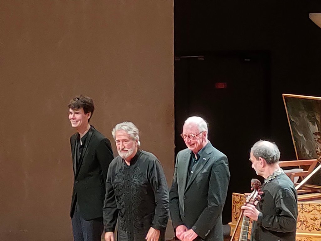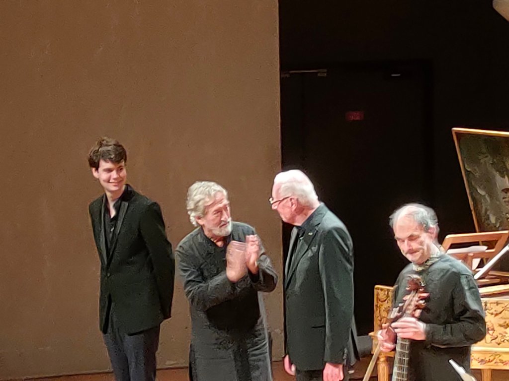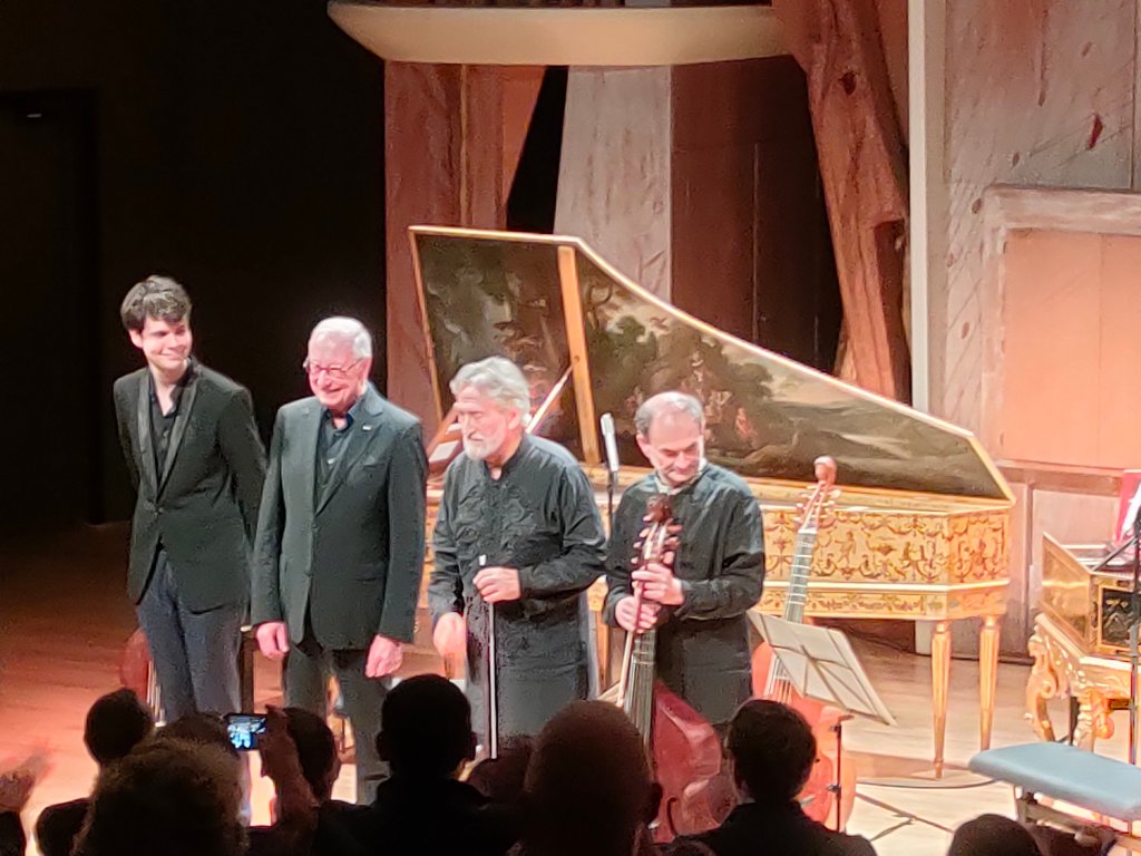 Hier soir donc, Jordi Savall, William Christie et Christophe Coin qui ont participé à ses soirées musicales, il y a une cinquantaine d’années, ont joué ensemble sur les instruments de cette grande mécène éclairée. C’était très touchant à plus d’un titre. Le quatrième musicien n’avait pas trente ans, il s’agit de Justin Taylor, un claveciniste tout en finesse qui a joué en duo avec Bill (William Christie) du Couperin, du Rameau, … et qui a annoncé qu’ils s’étaient pris d’amitié en préparant ce concert et que la semaine prochaine ils allaient enregistrer un album ensemble.