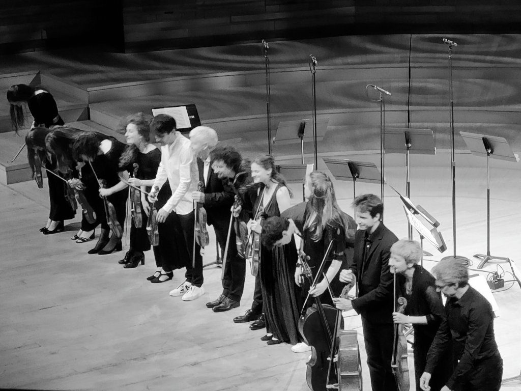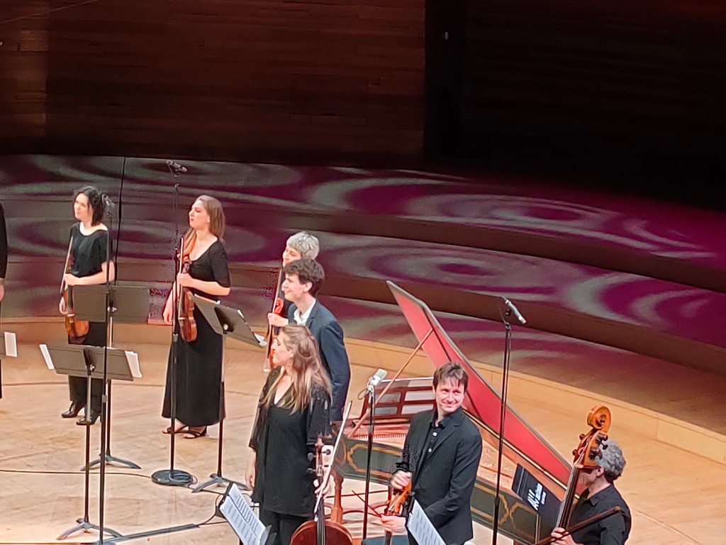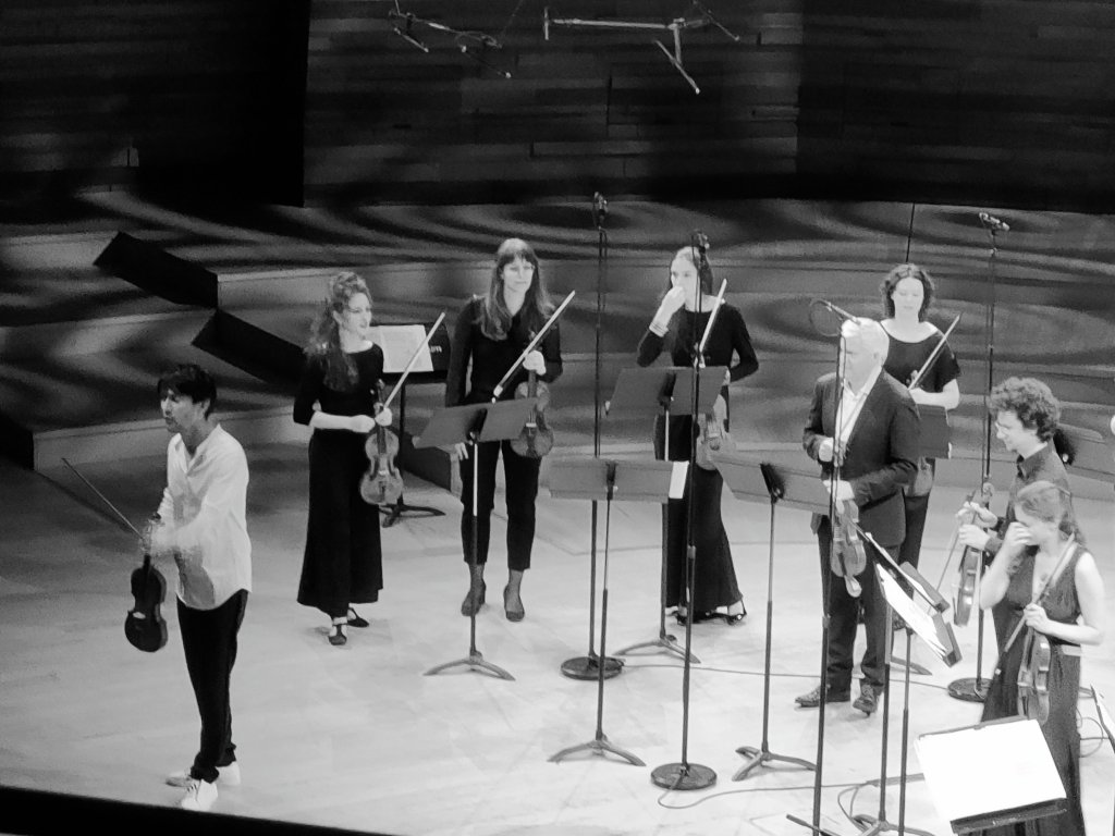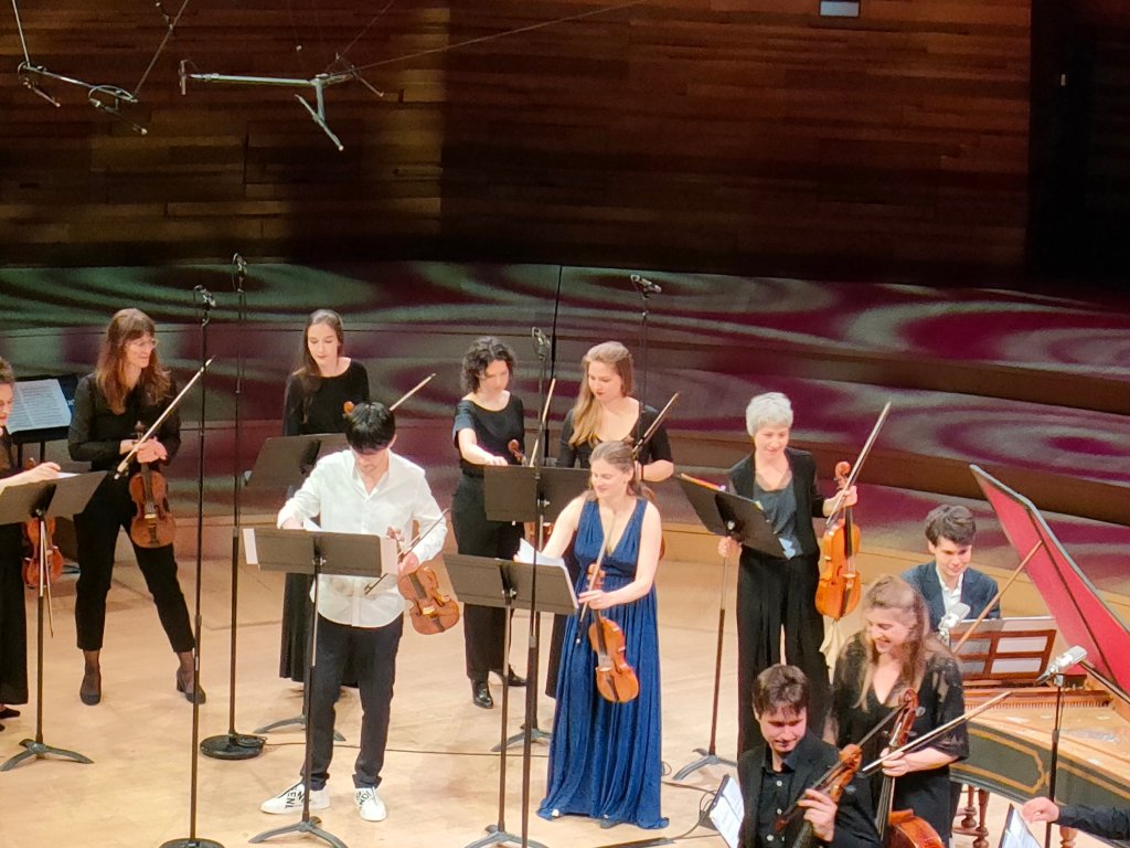 J’avais, comme bien des amateurs de musique, rendez-vous avec l’ensemble « Le Consort », qui, cet après-midi réunissait 9 violonistes, 1 altiste, 2 violoncellistes, 1 contre-bassiste et 1 claveciniste. Ils ont ouvert le concert avec Telemann, son concerto pour 4 violons en sol majeur TWV 40:201. Une œuvre intimiste au commencement, 4 violons soli, le temps du 1er mouvement puis l’ensemble a joué d’une seule voix et une joie communicative s’est installée pendant 2 heures.