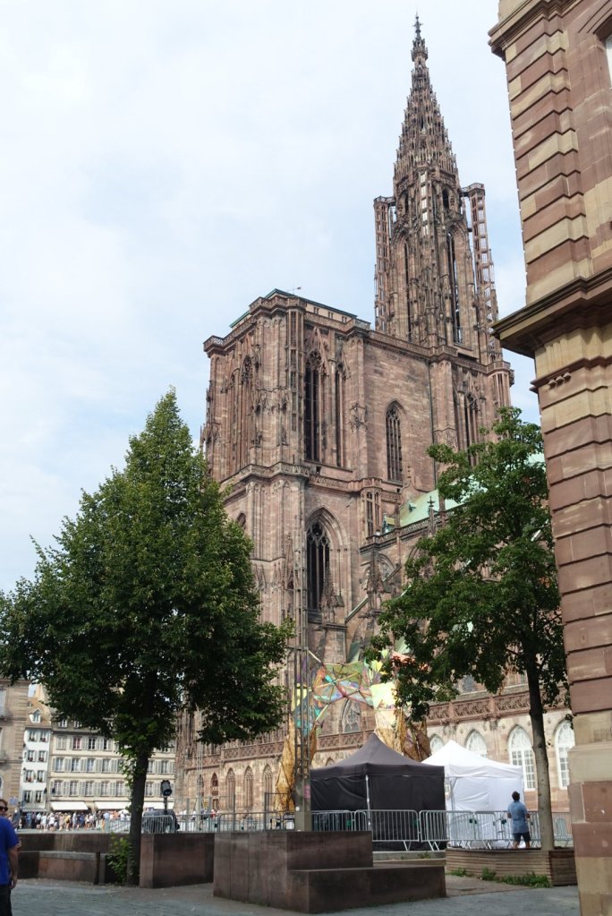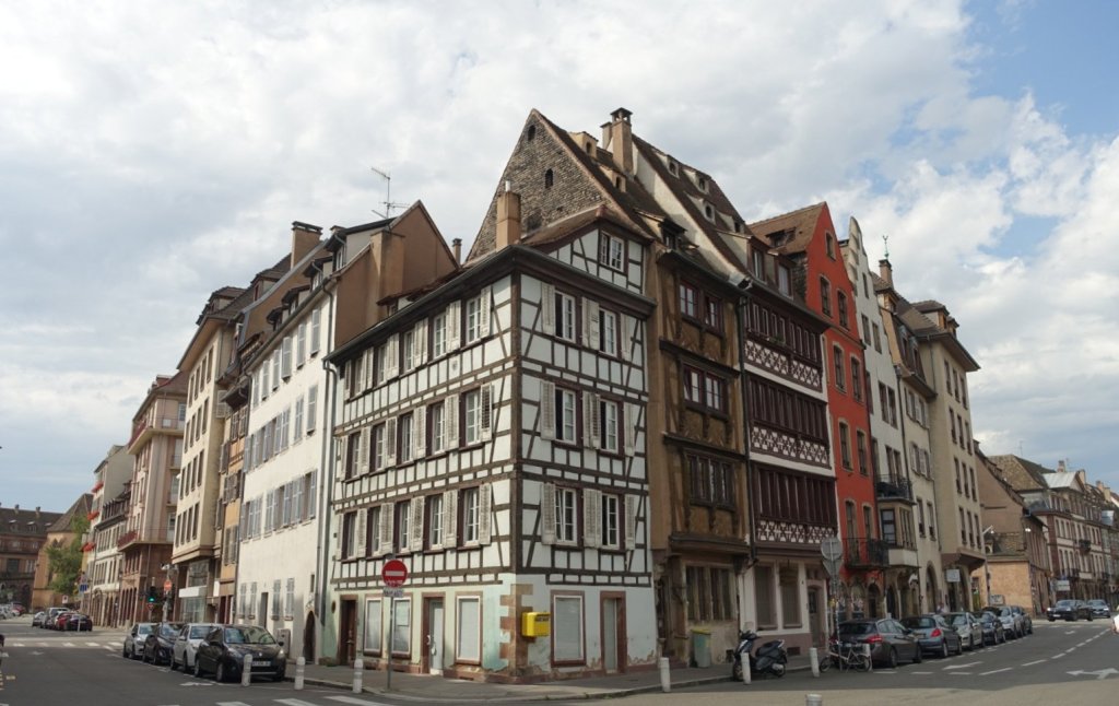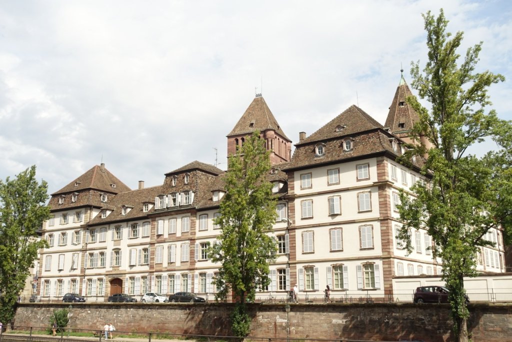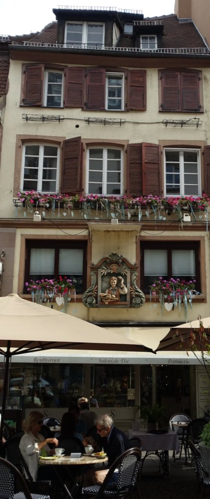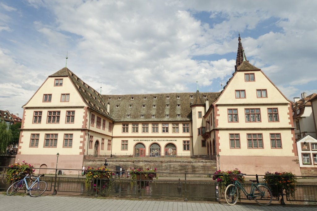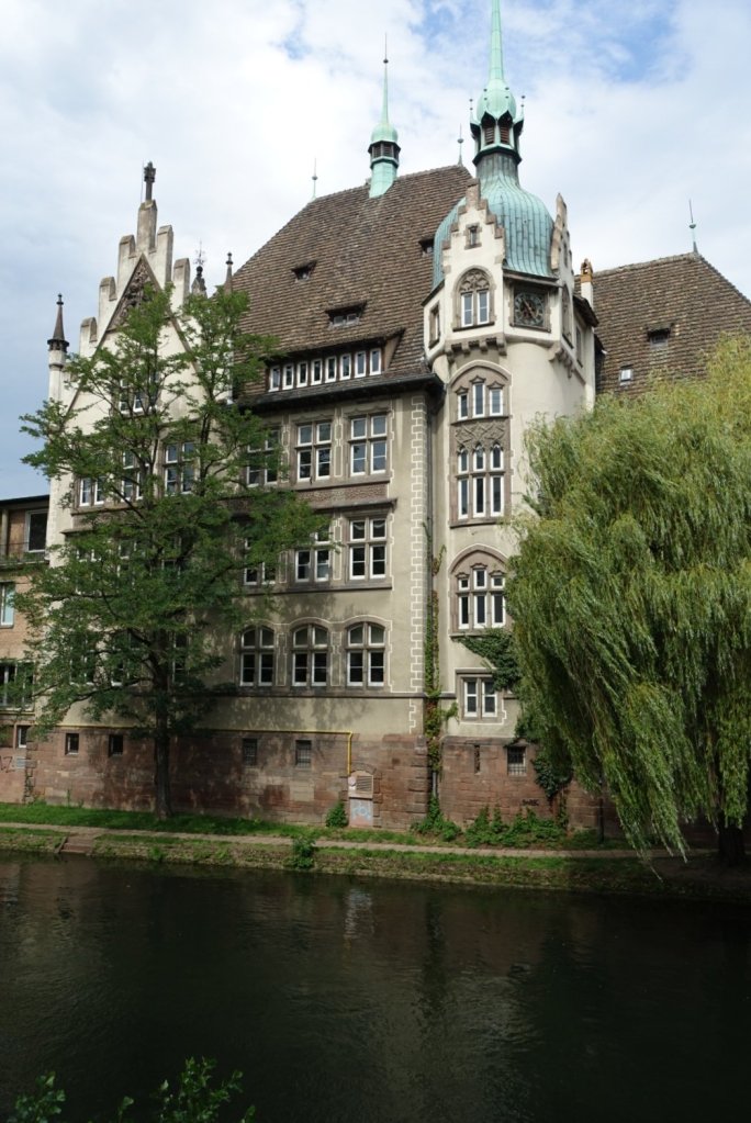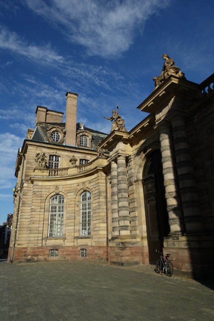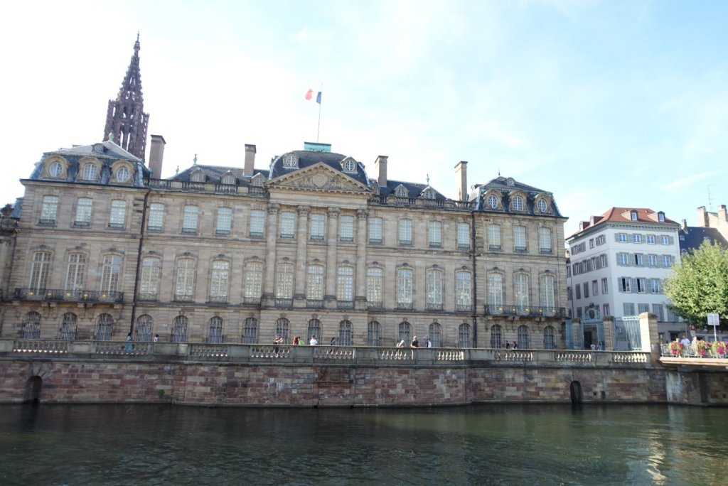 La vieille ville médiévale de Strasbourg se love dans les bras du Rhin Sur la gauche le Musée Tomi Ungerer illustrateur de livres pour enfants notamment Le Muséee historique de la ville Des tourtereaux Le Musée de l’oeuvre Notre-Dame sur la place du château à droite de la cathédrale du même nomPetit jardin du musée de l’oeuvre Notre-Dame dépositaire de sculptures et d’ouvrages originellement présents dans la cathédrale et épargnés par les révolutionnaires Le Palais du Cardinal de Rohan Soubise fils naturel de Louis XIV qui héberge le musée des beaux-arts, le musée des arts décoratifs et le musée archéologique. Il s’agit d’une construction comparable aux hôtels particuliers du 18ème siècle parisiens. L’architecte est Robert de Cotte.Le même hôtel particulier Rohan côté place du château dans le prolongement du musée de l’oeuvre Notre-Dame sur la place du château à droite de la cathédrale La rue des pucelles Incursion dans le 20ème siècle, c’était pour voir si vous suiviez !L’église protestante Saint Guillaume Rue des Tonneliers Le mari de Sophie Taeuber, tous 2 des artistes hors pair que j’adore Maison médiavale La même d’un autre point de vueLa maison Kammerzell, maison typique de Strasbourg datant du 16ème siècle La façade de ladite maison Kammerzell connue désormais aussi comme restaurant alsacien typique de qualité La cathédrale Notre-Dame place du château