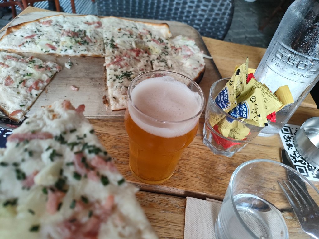 Tarte flambée à la nouvelle poste, elle était croquante, crémeuse, pleine d’ail, de fines herbes, d’oignons rouges et de lardons. Excellente. Et la bière pression m’a regonflé les pneus. Pause café en face. Expresso de l’Equateur acidulé aux accents chocolatés et citronnés.