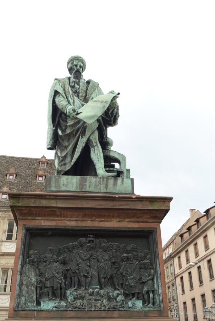 Gutenberg est né à Mayence et avant d’inventer la typographie il exerçait le métier d’orfèvre. Il a vécu à Strasbourg et c’est ici qu’il aurait inventé le procédé des caractères mobiles qu’il a ensuite mis en oeuvre à partir de 1452 en imprimant 180 exemplaires de la Bible en 42 lignes