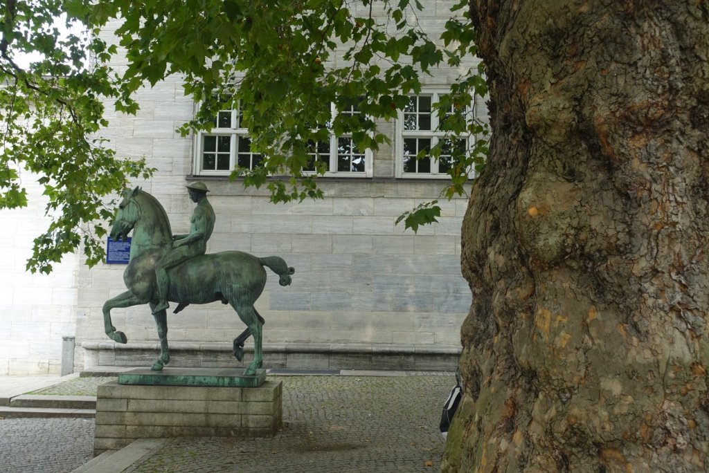 La partie moderne du musée, lieu d’exposition d’art contemporain dans lequel j’irai cet après-midi Le bâtiment principal datant de la fin du 19ème siècle – des êtres humains lisant le smartphone dans les arbustes…Sculpture de Lüginbuhl