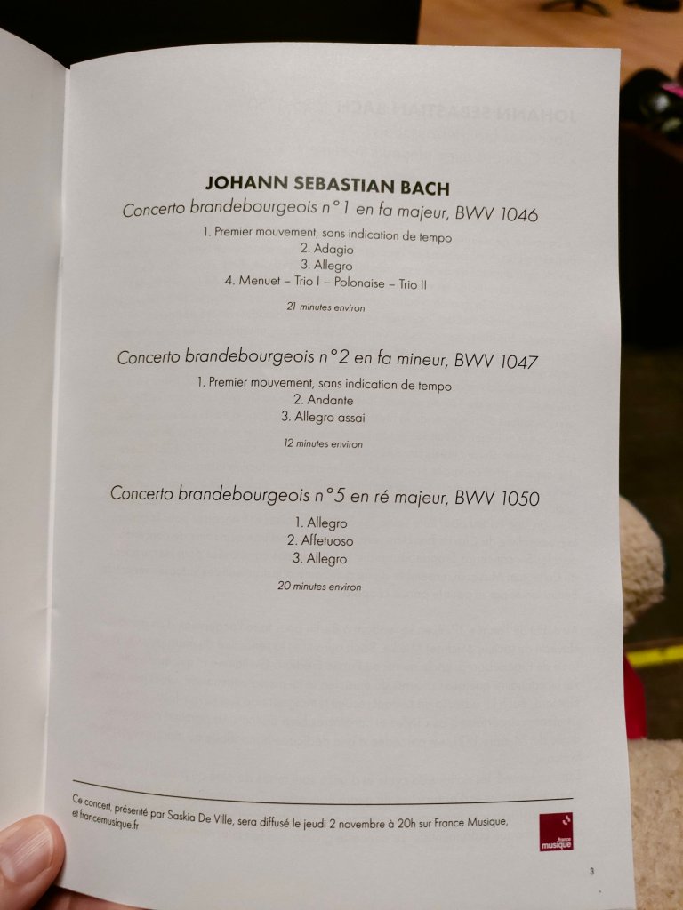 En fin matinée, rdv avec JS Bach et des musiciens de l’orchestre de radio France à la maison ronde. Trois des six concertos Brandebourgeois sont joués les 1, 2 et 5. Ils ont été créés il y a 302 ans.
