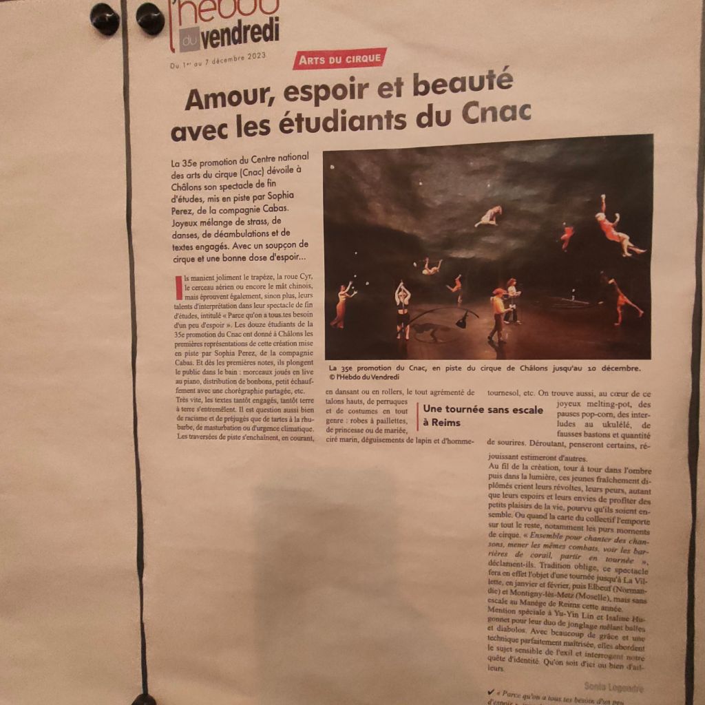 12 élèves tout juste diplômés de l’école du cirque de Châlons-en-Champagne nous ont mis au parfum en nous accueillant à l’entrée avec des pop corn, des verres d’eau ou des éventails. Originaires du monde, d’Espagne, de Chine, d’Allemagne ou d’ailleurs en passant par ici, hétéro, homo, ou trans, ils ont créé ce spectacle « parce qu’on a tous toutes besoin d’un peu d’espoir » pour une tournée d’une trentaine de dates et après, chacun chacune mènera sa barque. Contorsionniste, trapéziste, à la barre fixe, enroulé dans un arceau, sur un vélo, que c’était beau, poétique, et plein d’énergie. Ils nous ont appris une danse en restant assis, ils jouaient aussi du piano, de la trompette du saxo basse, et du ukulele et ils chantaient. Le tout était rythmé par leurs pensées qu’ils exprimaient haut et fort, chacun chacune à sa façon…L’un d’entre eux a dit « Je trinque à ceux qui osent dire encore je t’aime ». J’ai alors réalisé que ça ne se disait plus, que c’était presque un acte héroïque, décalé, iconoclaste. Oser, oui, oser, dire, vivre, ses rêves d’enfant, et d’adulte, sans en avoir peur, cela paraît si simple sous un chapiteau…
