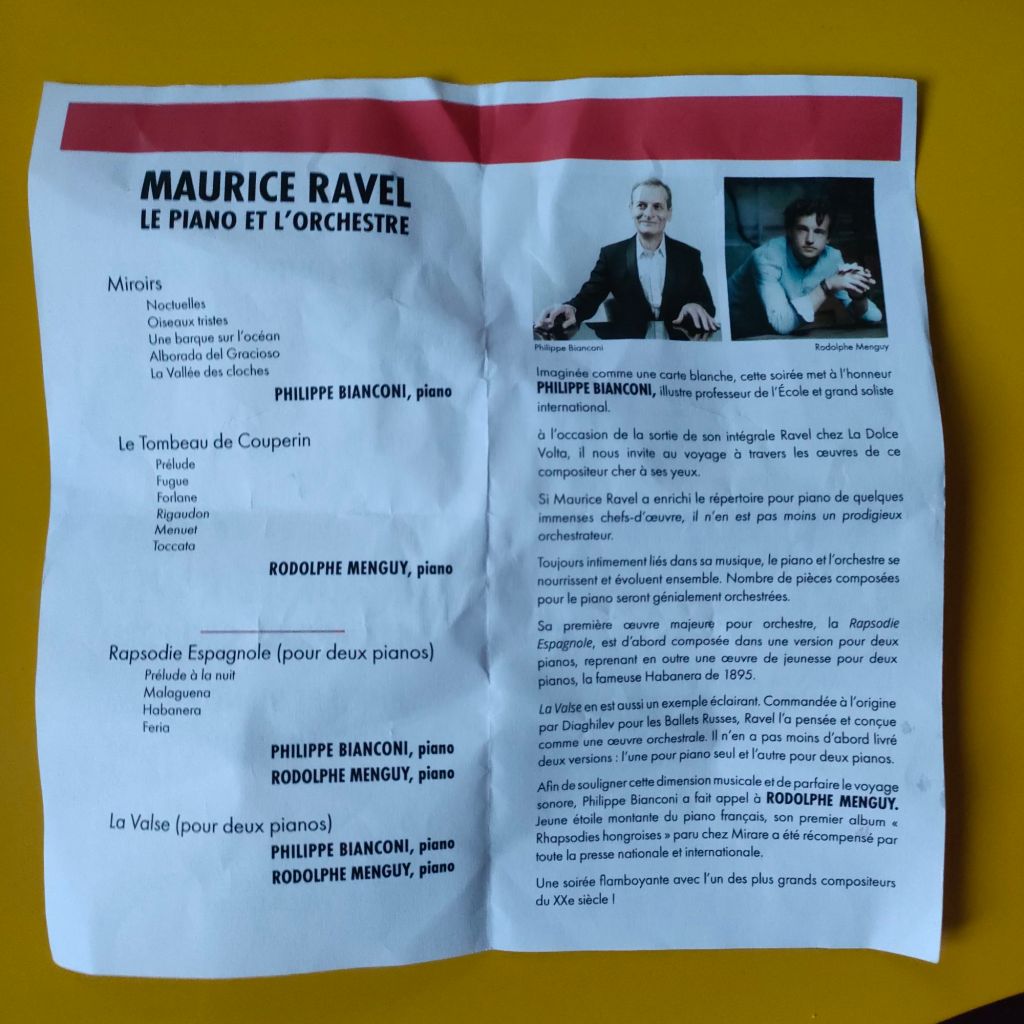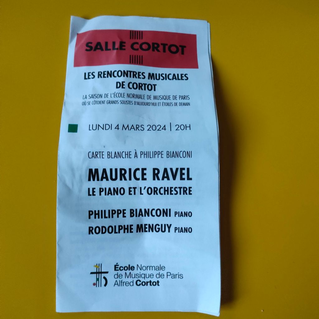 Et toute l’année des concerts des disques lui rendent hommage. Lundi c’était fabuleux salle Cortot. Philippe Bianconi qui a sorti une quasi intégrale de sa musique de piano chez Dolce Volta en 2023 a joué miroirs. Son toucher était multiple, il donnait à voir tous les instruments de l’orchestre. Le piano n’était pas que percussions, les couleurs les nuances les ambiances se sont succédé doucement, dans un quasi silence. Ravel composait pour piano puis l’orchestration venait ensuite (le Tombeau de Couperin…).