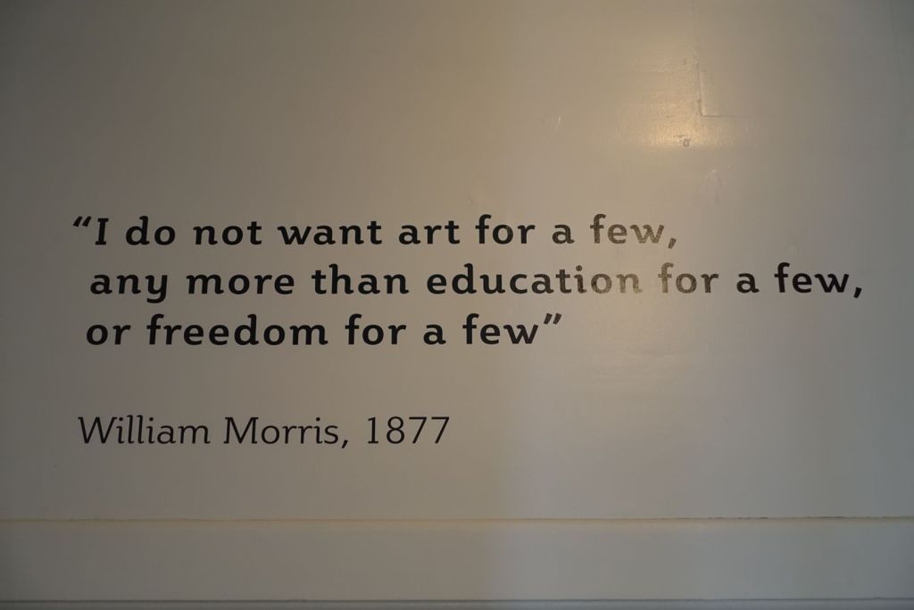 Ce matin, je suis partie bon pied bon œil en direction de Shepherd’s Bush Station pour rejoindre la William Morris Gallery, au nord est de Londres sur la Victoria Line à l’opposé de Brixton où est né David Bowie. Tout comme le quartier où je réside la nuit ici et à Paris, la diversité à Walthamstow est à son paroxysme et sa gentrification au point zéro. Les maisons se ressemblent avec leur bow window, de la brique, et toujours des coins de verdure.
