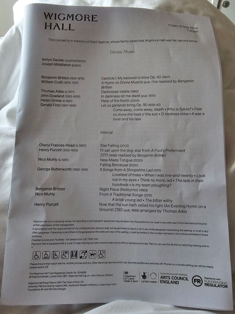 Retour hier au Wigmore Hall, pour un récital du contre-ténor Iestyn Davies accompagné du pianiste John Middleton. Au programme, airs anciens et contemporains de Dowland, Purcell en passant par Finzi, Britten, Adès et Muhli. Divin, typically British. Échanges avec mes voisins assidus, l’écoute est très intense. Amateurs silencieux, recueillis.