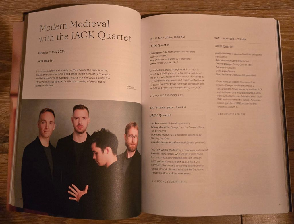 Pour s’immerger totalement, rien de mieux que d’y aller à fond, et aujourd’hui, ce fut exactement ça ! Le JACK quartet, composé de 4 musiciens américains, proposait 3 concerts dans la journée et je suis allée aux 3 : 11h30, 15h et 19h30. Leur répertoire centré sur de la musique contemporaine n’était pas toujours évident, pour autant c’était captivant, par la rythmique, la variété et la qualité de leur jeu. Parfois, c’était à la limite de la musique, une sorte de R&D fondamentale puis appliquée de ce que chaque instrument peut sortir de ses tripes. D’aucuns auraient dit leurs violons sonnent faux, ils ne sont pas accordés, ou pourquoi le violoncelliste joue du tambour et tape sur son instrument. In fine, j’ai été heureuse et immergée. Dans la salle, nous étions 50 max à chaque représentation dont 10 étaient des proches des musiciens sur une capacité de 600 places, ça fait peu.